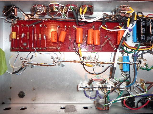 What I like about most about this amp is its ability to let your guitar setup shine through. 3 different guitars will give 3 diff sounds. So you can get whatever meets your fancy, chicken pikin to 2 humbucker overload and eveything in between. I strayed a little in the design with the grounding, I don't like to use the chassis as a conductor only as a sheild also I'm not real fond of silver mica caps and I installed the larmar master volume.