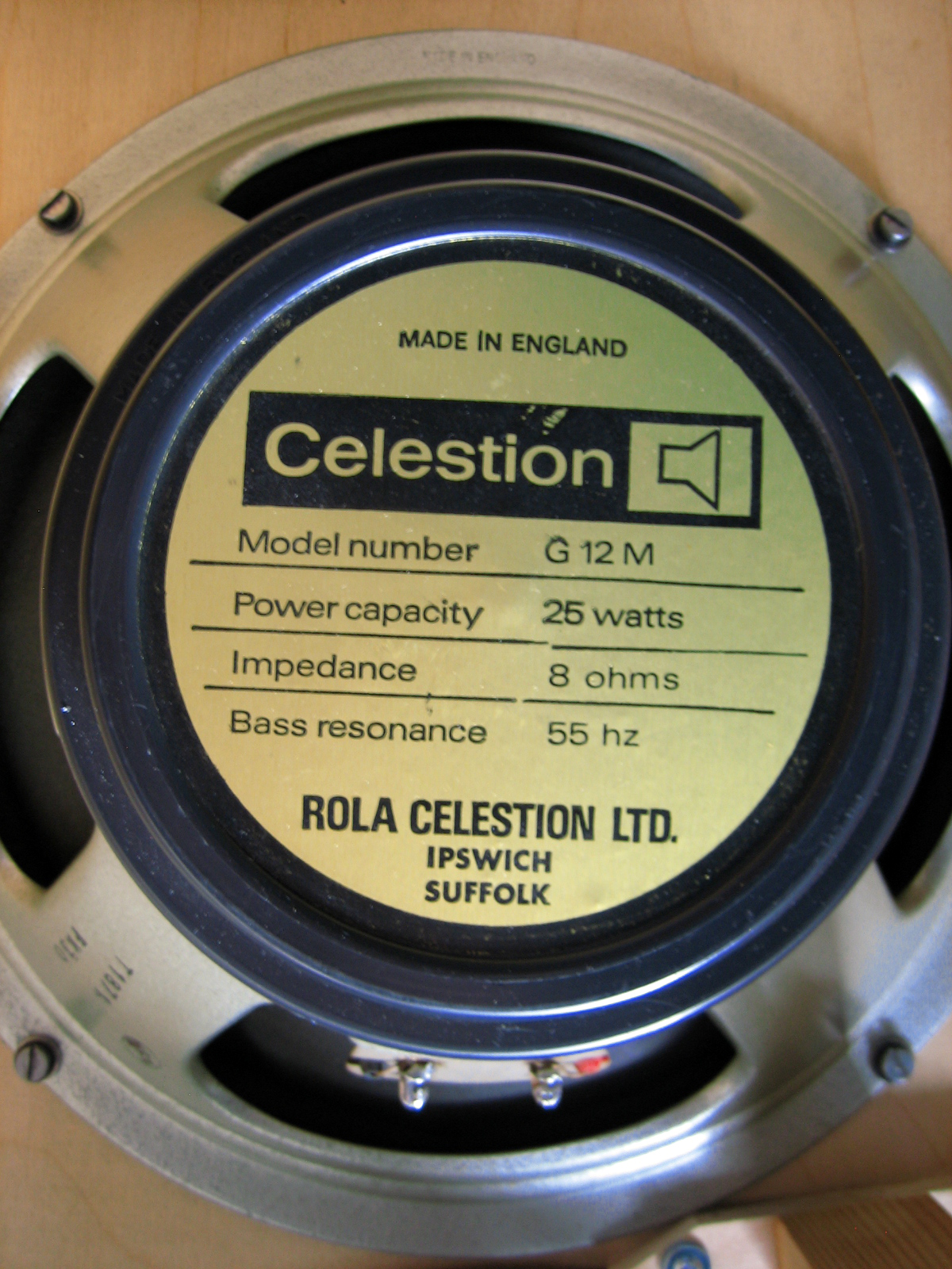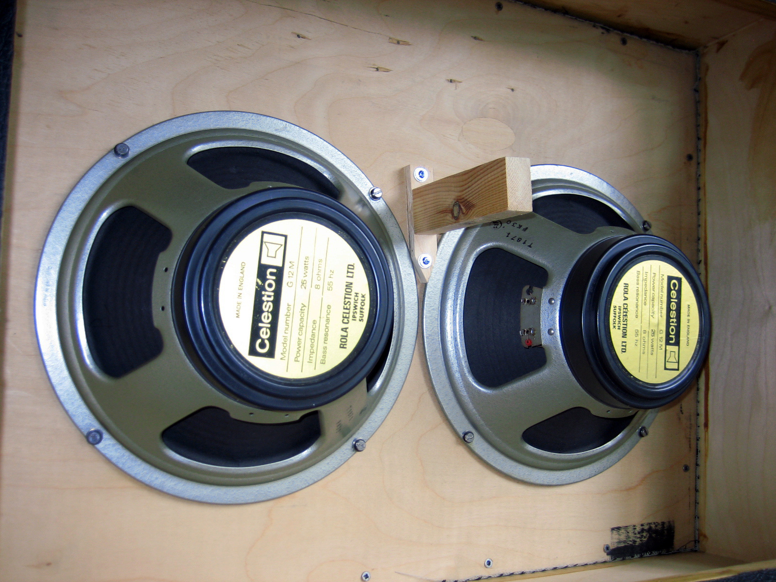 Also, I’ve loaded the cab with a pair of G12M T1871, 25 watt, 55Hz, 8 Ohms (original ‘444’ stamped Kurt Mueller cone, FK30 = 30th June 1977), same date code for both, and they sound dead killer. They are wired in series. This cab now is the perfect weapon for small venue and studio recording, it works great in association with my 1987 ’68 species Marshall Head clone. It’s an evidence that both love Stratocaster !^).