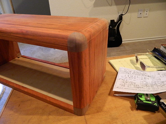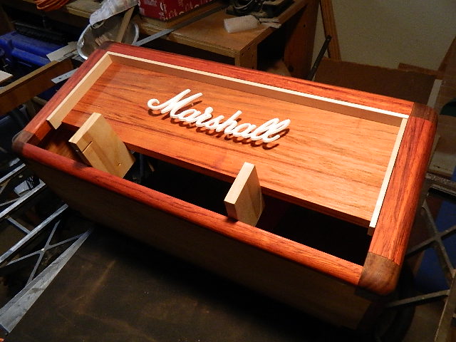 Head cab time. I found some padauk and began to plan. I decided to make the head with the same geometry as Marshall used - 1" round overs on the leading edges. Instead of plastic corners these will be walnut, the piping maple.