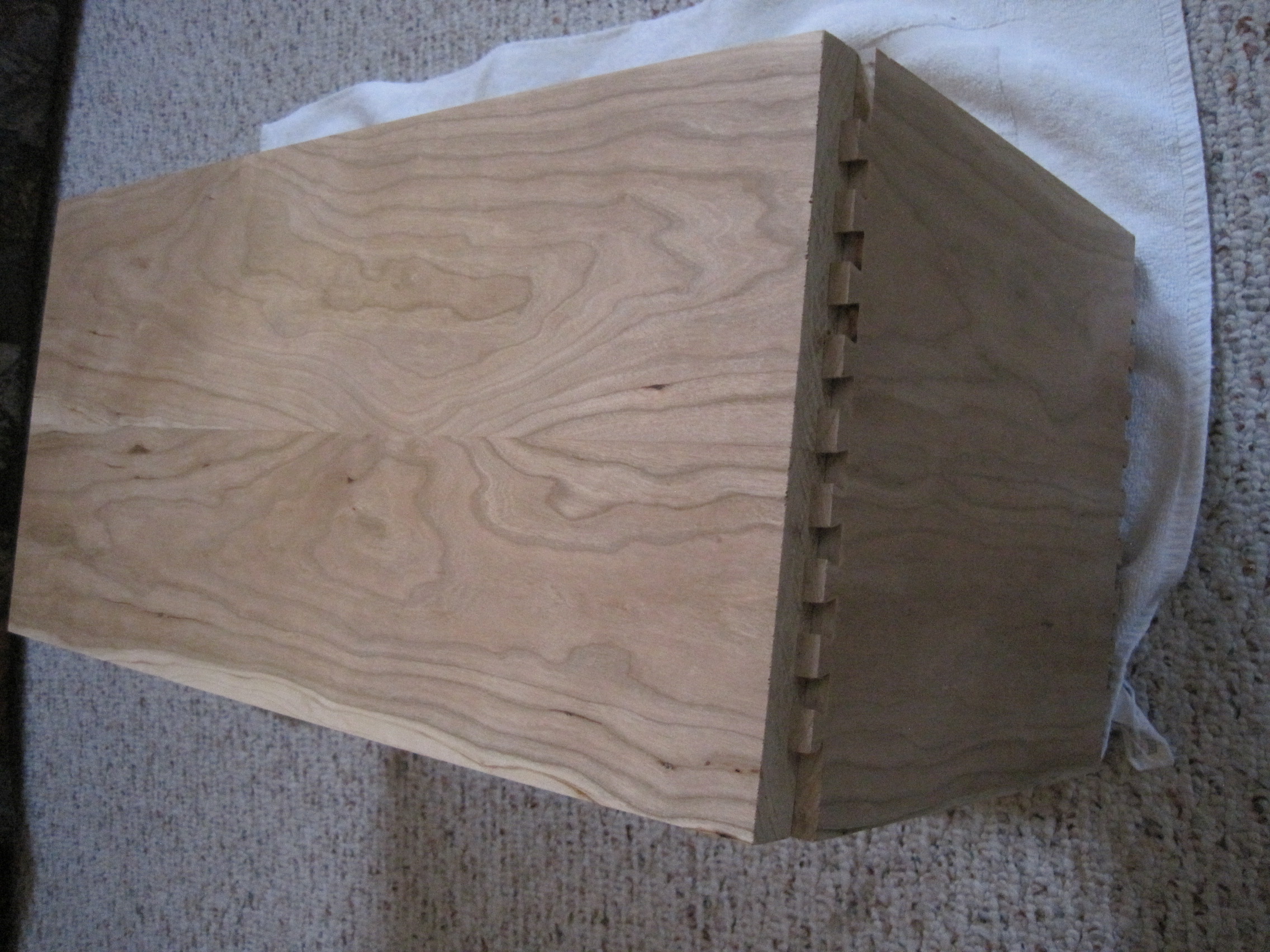 The top and sides are cut from one continuous board, side-top-side, so I think I managed to match them at the corners. The bottom is not as nice looking and not worth showing, IMO.