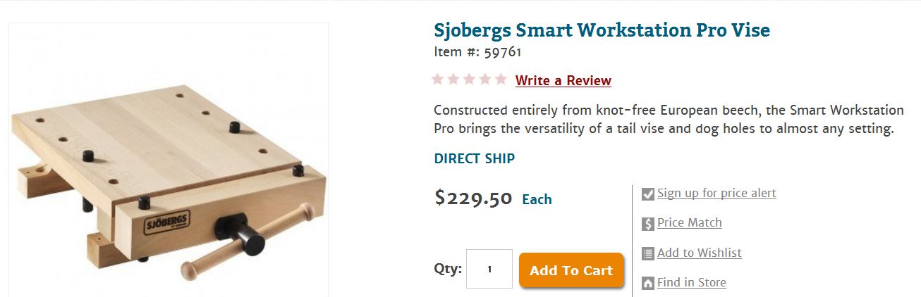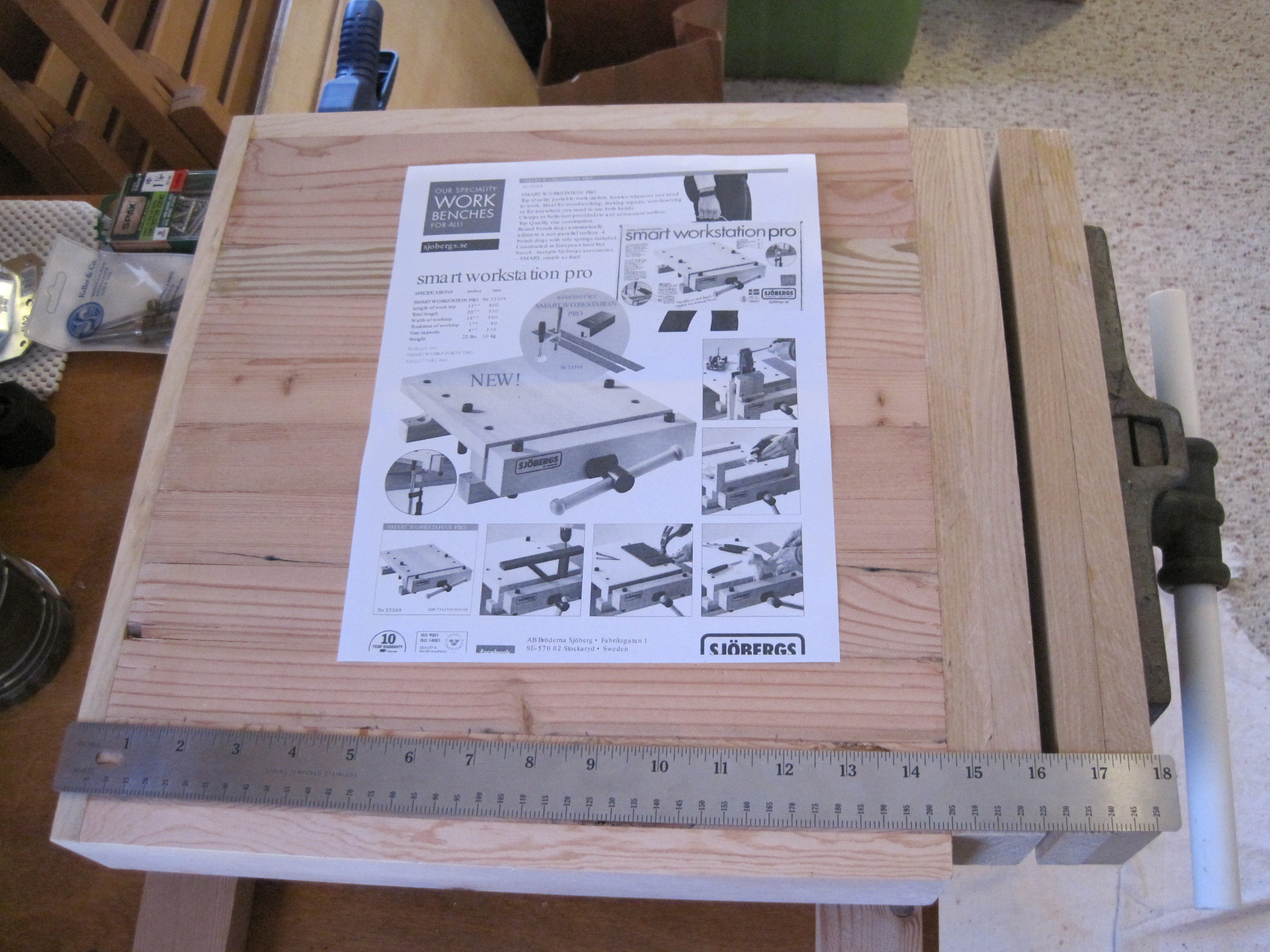 The only thing left to do is drill holes for the bench dogs. I'm not quite sure where to place them and the best way to drill them. My current thinking is similar to the Sjobers item. I don't know the exact placement on that, but I am looking at two rows about 11" apart. In addition to the two dogs in the vise jaw, I think that 2 rows of 3 dog holes in the work top will be more than enough. The vise screw gives me almost 10" of extension, though it seems I don't really want to open it more than 5-6" because it makes for a lot of outboard weight as the metal jaw plate is quite heavy. Also, it sags after opening too much. I believe I can compensate for the sag by placing some sort of guide on the underside for the screw. Details, details...
