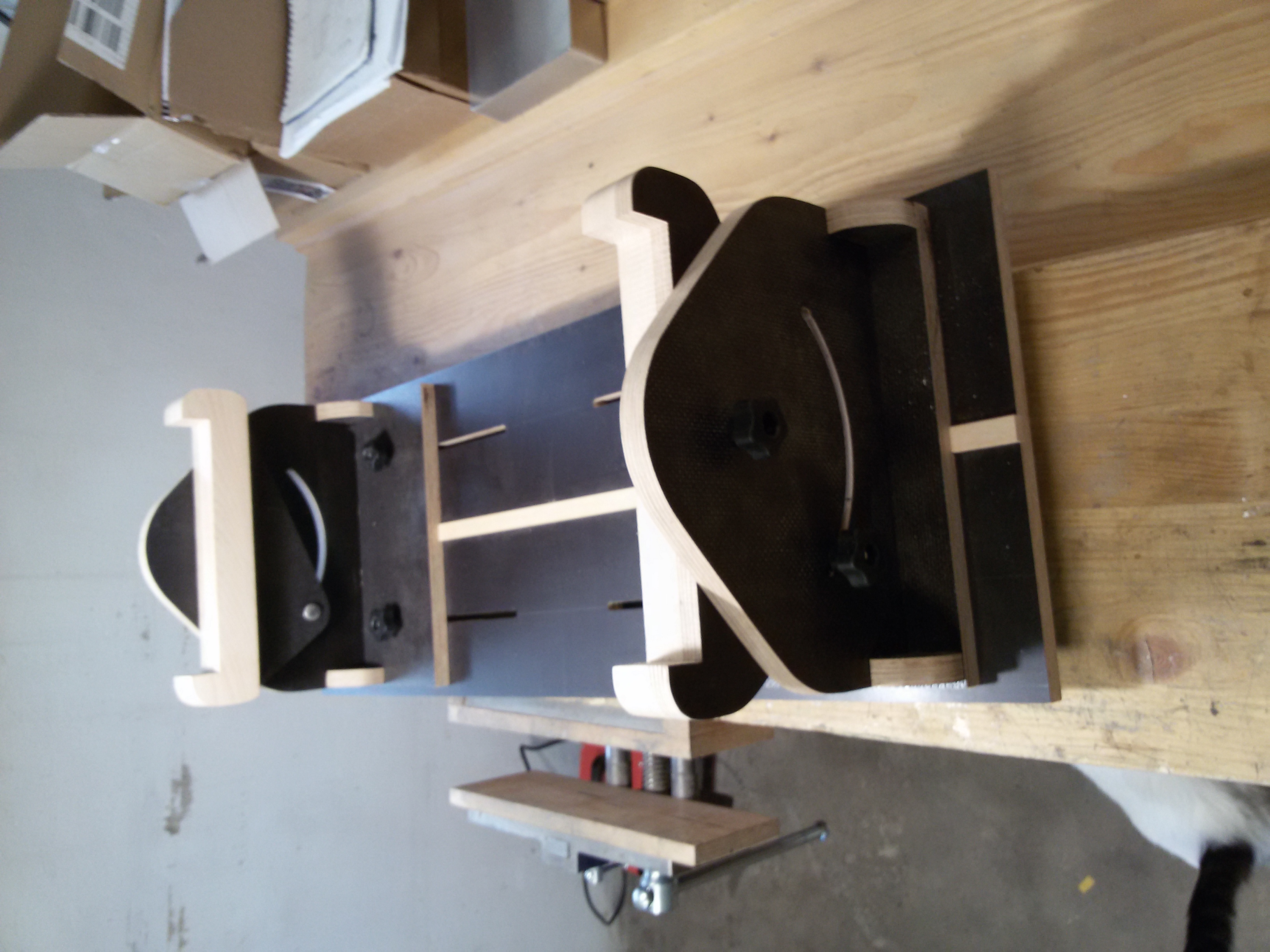 In the plan, I forgot to include a 10mm x 15mm birch spine down the centre of the base. It was glued into a slot 9mm deep, 15mm wide slot all the way down the centre of the base, and the brackets slide on top with a corresponding 3mm deep channel. This provides some lateral stability and should prevent the base bowing and it also keeps the brackets square when adjusting them in and out. I also put four feet on the base - you need these because otherwise the heads of the carriage bolts will snag on the bench it is sitting on.