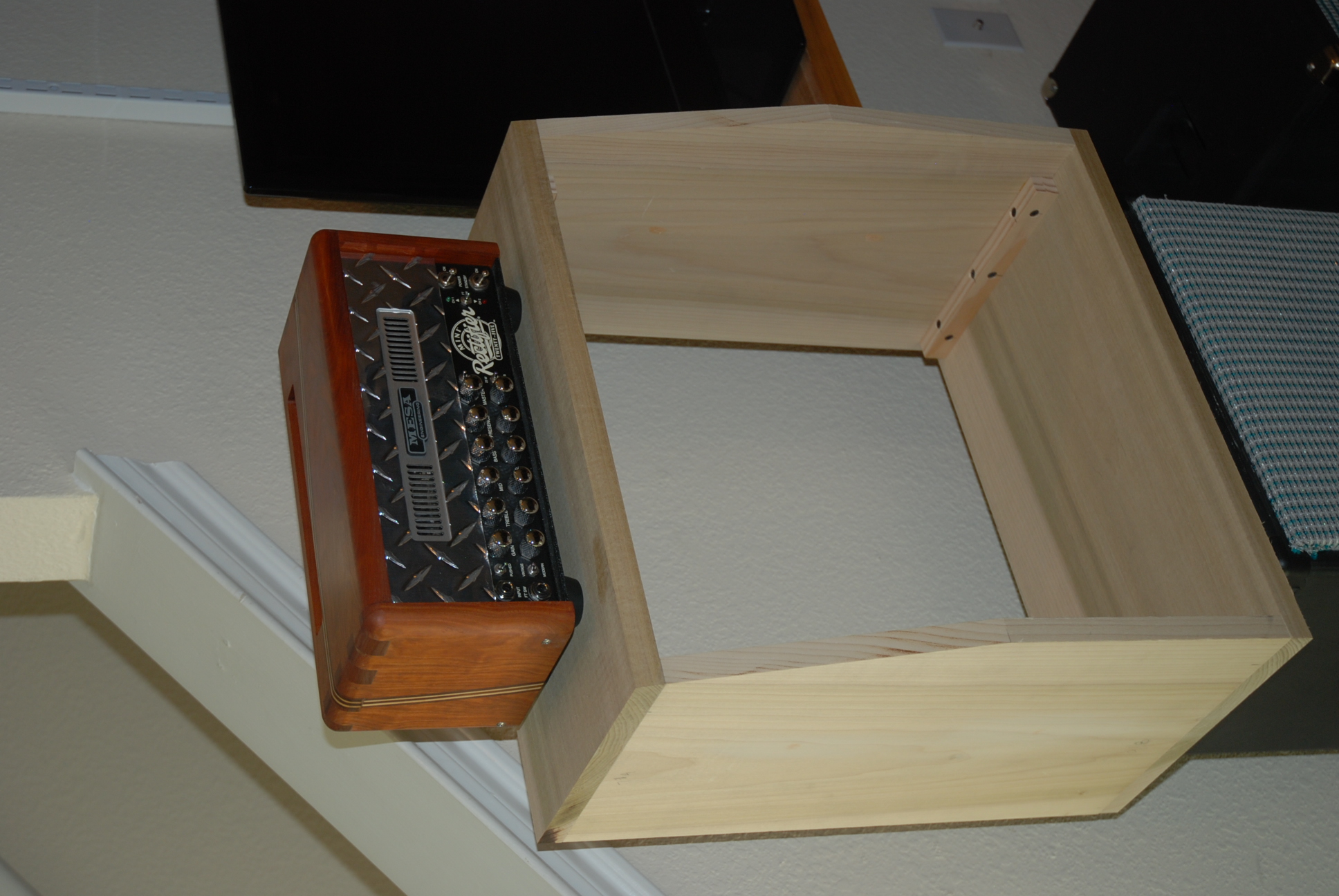 Corners now rounded, back cut and drilled. Baffle sanded and painted. Boo boos cussed, sanded/filled or ignored. The finish will be oil. Looking into external handles or routed drawer pull styles. May just use a top handle as I expect it to weigh in the low 20lb range.
