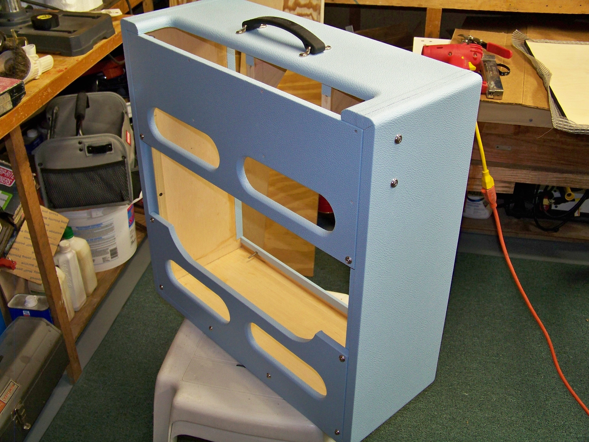 The narrow panel cabinet's baffle is secured to the top and bottom valences with a screw in each corner. I put a rubber washer between the baffle and the valence. Let me find a few photos - one I did in plywood. I used a 15" speaker on this one.