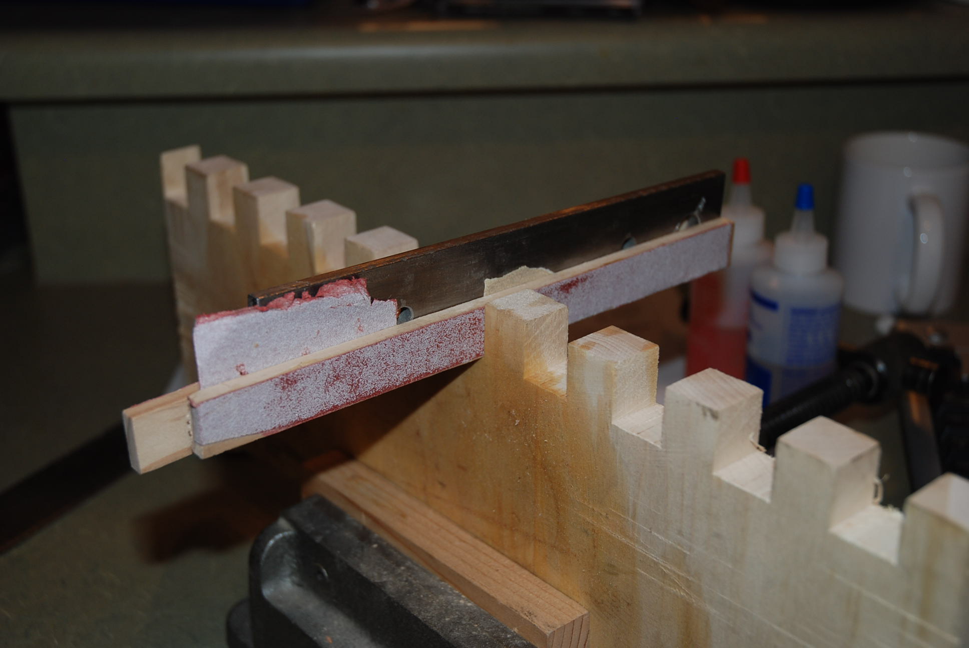 Sanding seemed to be the best method to remove minute amounts of wood in a controlled fashion. I tried hot gluing sandpaper [150 grit] to two sides of a piece of wood. It would just press fit into the joint requiring a rocking motion to seat into the cut. I noticed two things - the sanding stick cut it's way into the slot and the tight fit kept the stick aligned. Promising until I ran out of glue sticks. No stores open this late at night so I had to wait. Can you believe that Lowe's had the gall to not open their doors to me until 8AM!