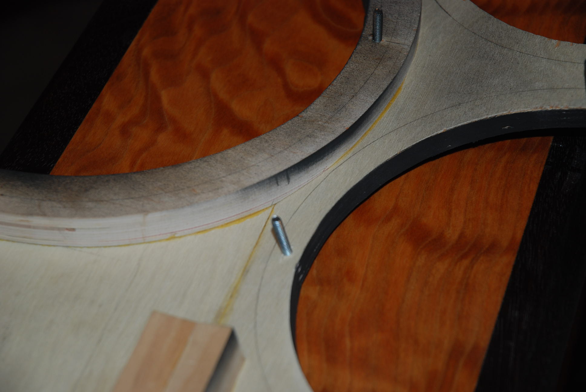 Also putting together a rotating jig to screw the router to, so I can do the speaker holes - I had an adjustable 12" hole saw, it just jams up violently and frighteningly on plywood, so I won't be using that anymore.