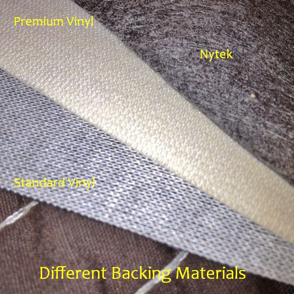 Then there's a third type which has a soft, thin felt type backing, is meant for clothing or tablecloths or car covers, VERY flexible and easy to stretch , not really meant for gluing but sewn or stapled, you can cover any complex shape with it but better hide joints (usually under the cabinet or head) because cuts are not clean, you always have some loose fibers messing it.