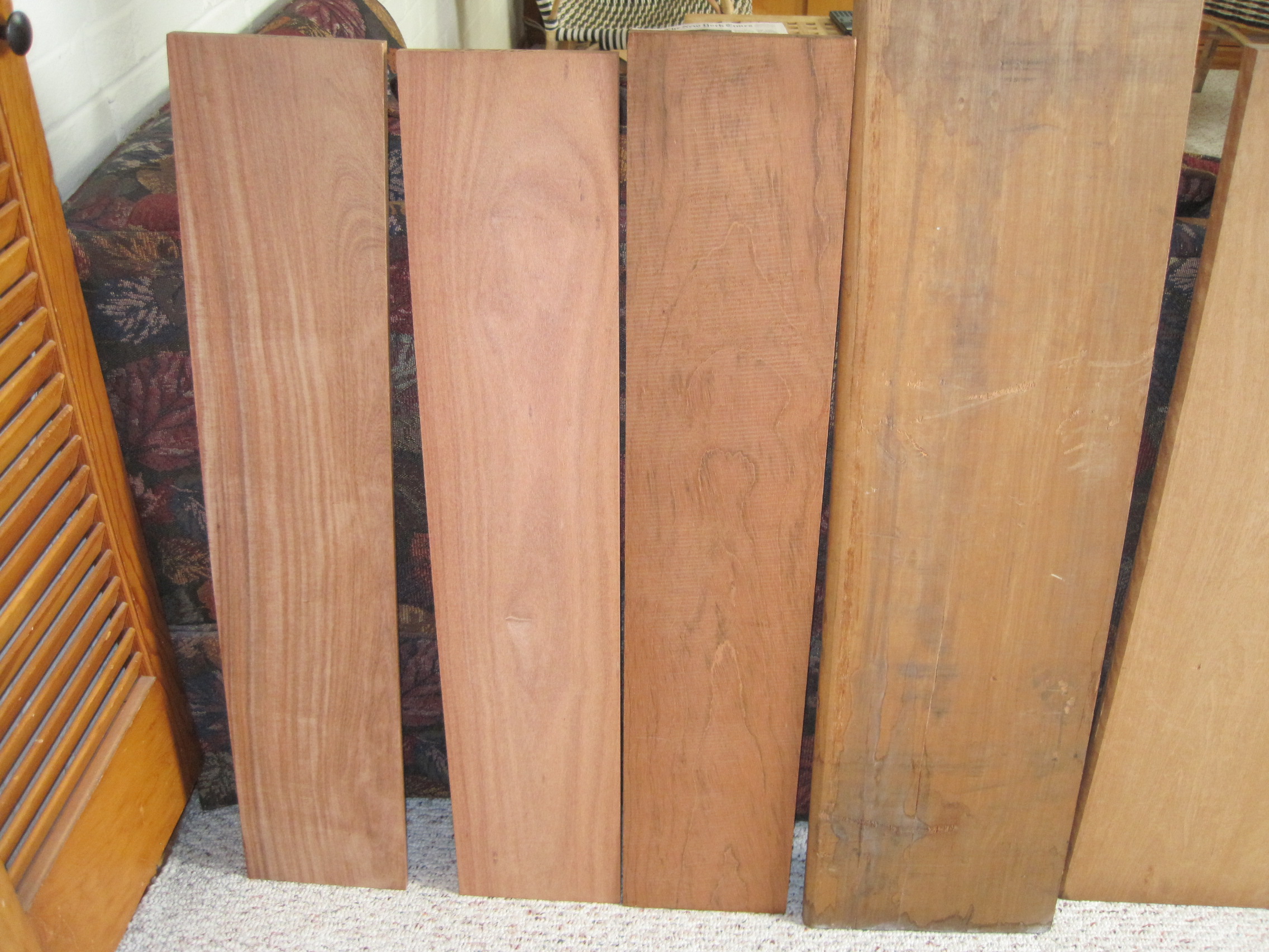 I sure I hope I did OK. Lumber Liquidators posted on CL for unfinished stair treads and risers that have been on the shelf too long. I paid about $2.25/bf for 12 boards, (7) 7" x 36" risers, and (4) treads 11" (including bull nose) x 36", and 1 tread 48" but not in great shape. 4 of the risers are domestic USA white oak, 2 are Santos mahogany, and 1 is a bowed Brazilian cherry that I thought had nice figure. The treads are all Brazilian cherry. I was able to pick through the stock. The 48" tread was sitting on the floor and, while crappy looking, I think there is quite a bit of it that can be salvaged. It looks like all of it except the oak are single boards, not jointed and glued. The guy who helped me was surprised I was finding single wide boards and commented they much have "been here for a long time."