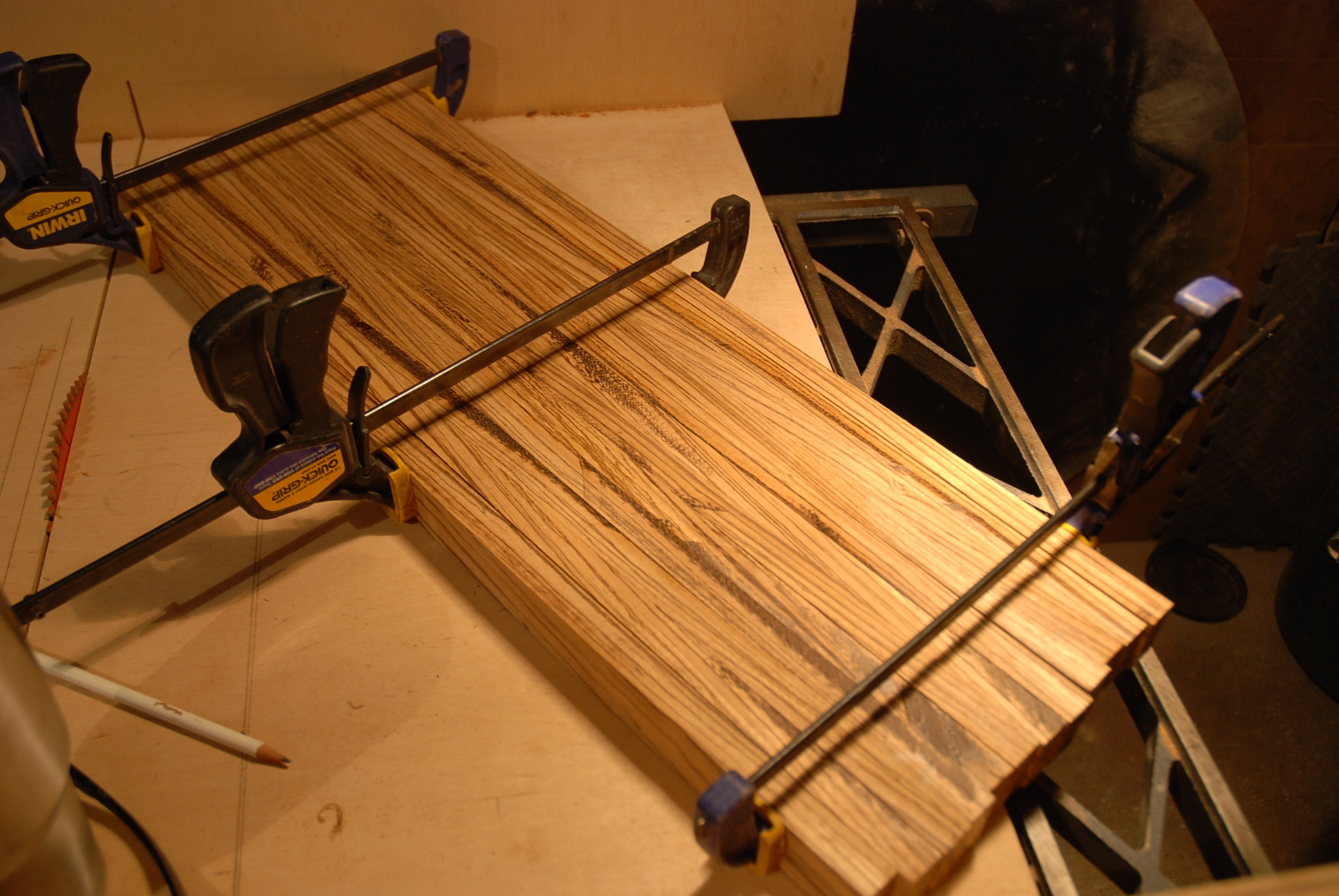 failed attempt to keep 'squirmy' wood straight. Zebra wood is not a happy wood - it loves to warp and cup after cutting.