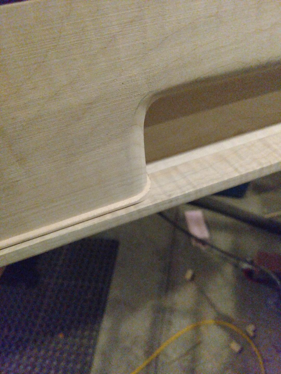 Test fit of the face plate with the logo cut in and the rough cut maple piping.