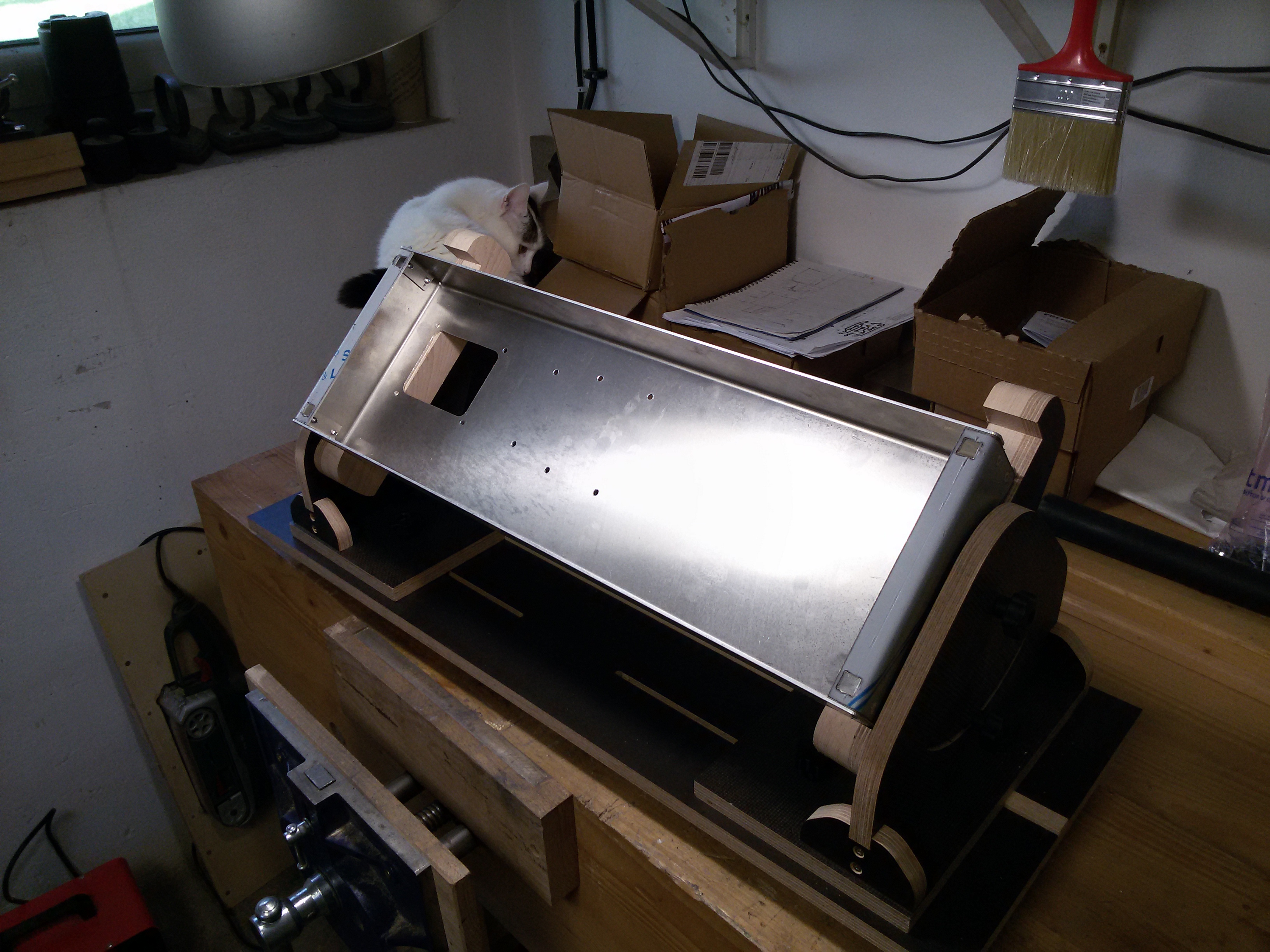 It's a simpler design than some and materials came in at around 30 Euros. Hard to say because I had some scrap pieces and parts lying around. I was lucky enough to find some nice hardwood, (plastic?) coated plywood (the kind used for table tops and trolleys) but it could be made out of 18mm (3/4") ply altering some of the dimensions slightly.