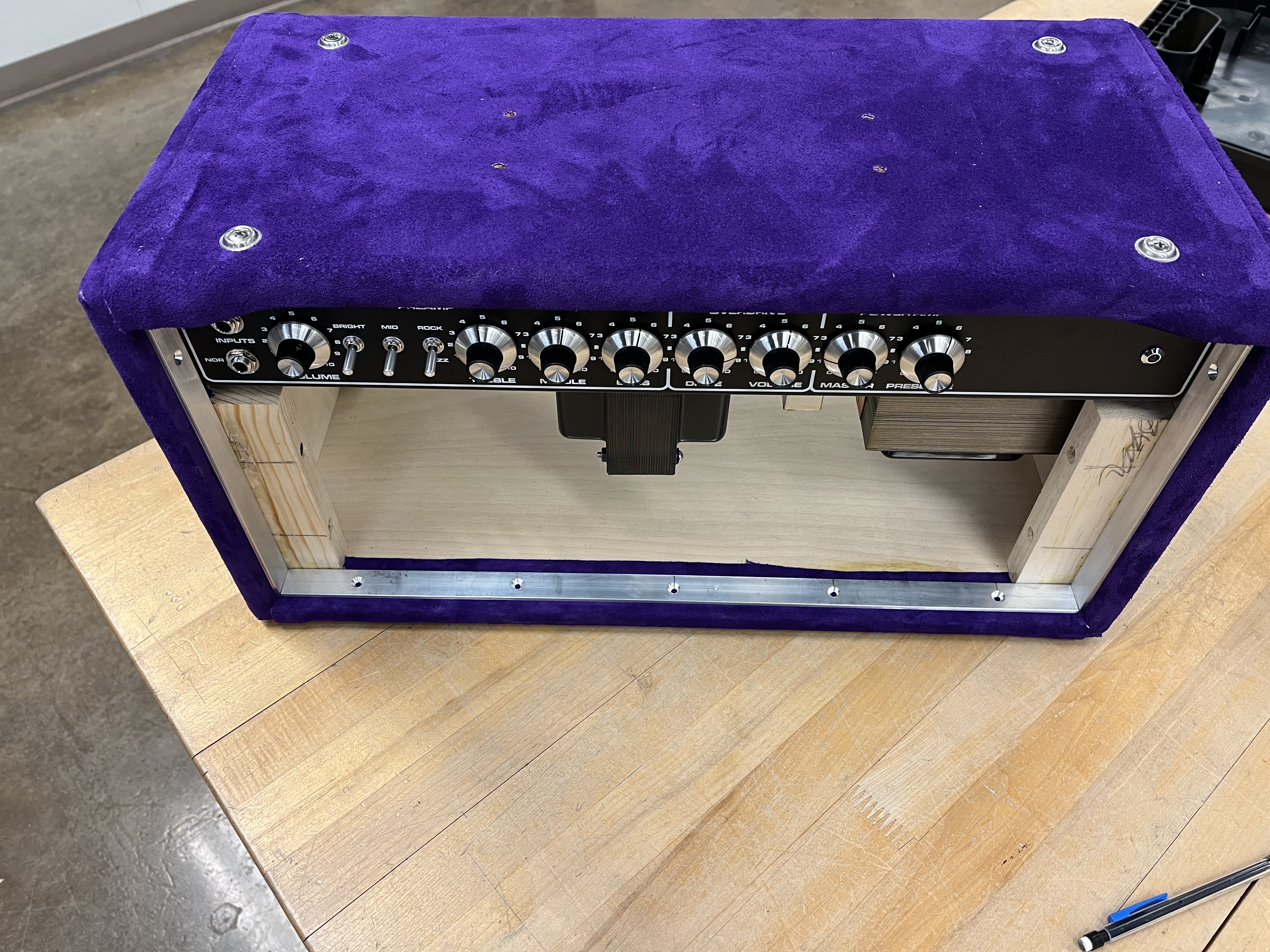 When you prepare the top aluminium bar (screwed to the top of the baffle plate) take account of the extra width you will get when you screw the vertical pieces in the sides of the cab. Even tolex has a little "give" and this suede type of covering will have even more. You might find you need an extra millimeter or so to make it full width. The vertical and the top (baffle) bar are easy to align when your chassis is fixed and screwed in position. Just sit them right up against the face plate and fix. You do the vertical pieces first, then the bottom against those, then the top with the baffle plate screwed in first as well. Go slow. :D