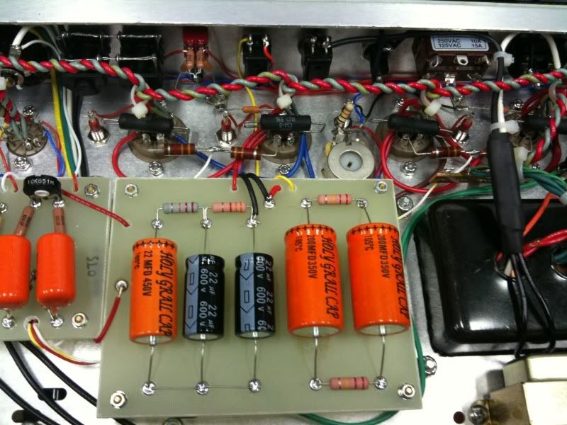 I decided to cross the tracks from the trainwreck side and build a 100W ceriatone OTS kit. I used Hammond iron (290FX PT, 1760W OT, and a 194B choke). I pretty much built it to nik's layout with the exception of the half power switch being like #124. I get whisper quiet sound out of it, that's it. I've gone over it 100 times looking for a problem but I can't find one, figured maybe someone with fresh eyes might catch something I missed... The very little sound that does come ou is very distorted, but like I said it's almost whisper quiet. The preamp volume, bright, deep, and rock/jazz switches have an affect on the sound, T-M-B have no apparent affect, OD level/ratio have no apparent affect, and master volume does very little... Any suggestions on where to start? There are no obvious cold solder joints, but that doesn't mean there isn't one. I'm going to spend the rest of te night checking solder joints unless someone has another suggestion. Some pics for your viewing pleasure...