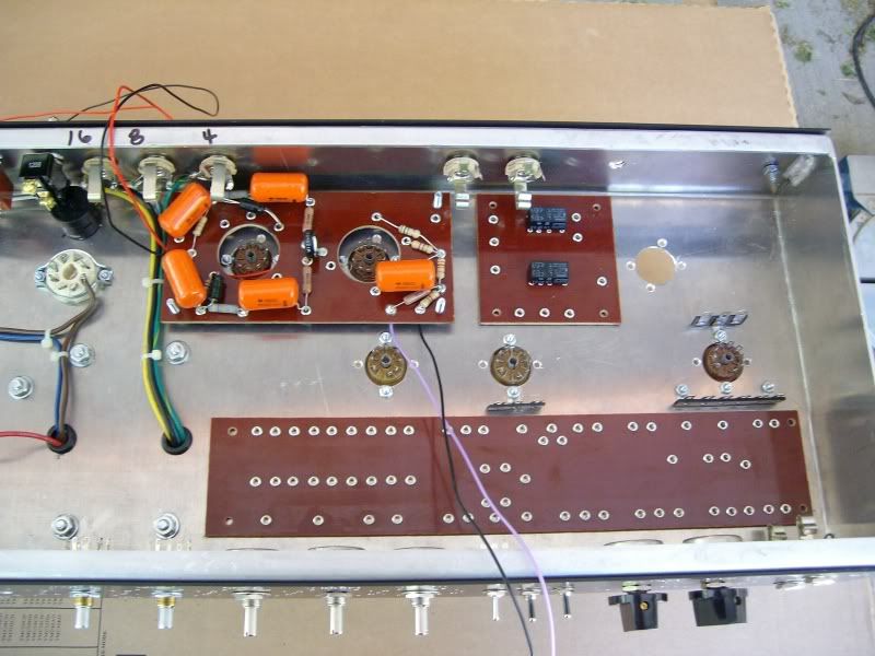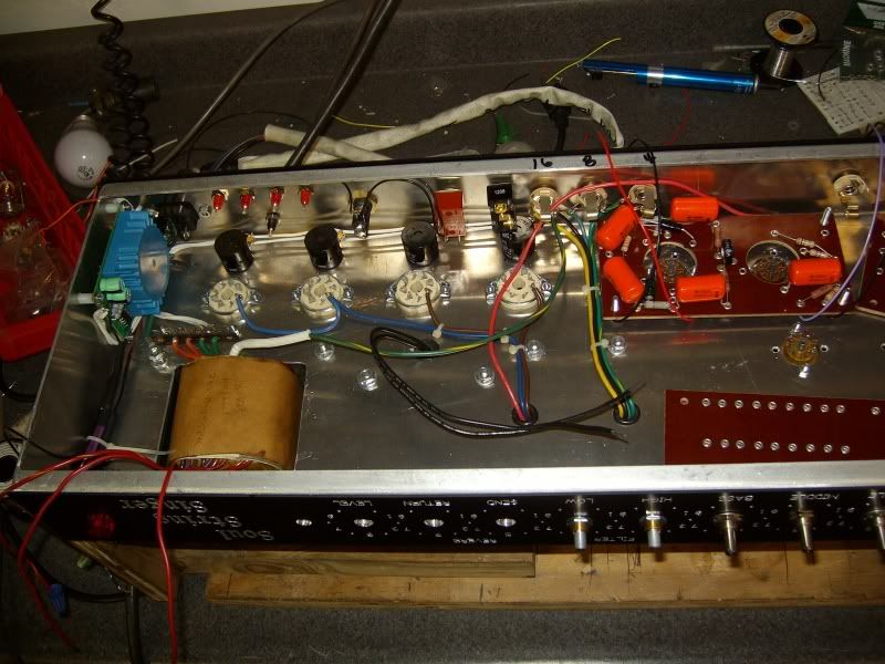 I've been forging ahead blindly on my Soul String Singer also. I'm building a 4-6v6 version. The preamp is basically an ODS non HRM, with relays that in normal (clean) mode, sends the clean signal through a one tube reverb, then when you hit OD, it removes the reverb and inserts the overdrive section in its place. I'm using a Prosonic OT, and a West Labs 30 watt Matchless PT. Here are some pics of my progress. Terry [im[IMG:800:600]http://i143.photobucket.com/albums/r160 ... ger007.jpg[/img]g][/img][im[IMG:800:600]http://i143.photobucket.com/albums/r160 ... ger005.jpg[/img]g][im[IMG:800:600]http://i143.photobucket.com/albums/r160 ... ger008.jpg[/img]g][/img][i[IMG:800:600]http://i143.photobucket.com/albums/r160 ... ger002.jpg[/img]mg][/img]