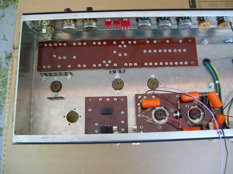 I've drilled out the chassis for the front and rear plates, drilled out the tube socket holes, and I've got blank circuit boards mounted in there.
