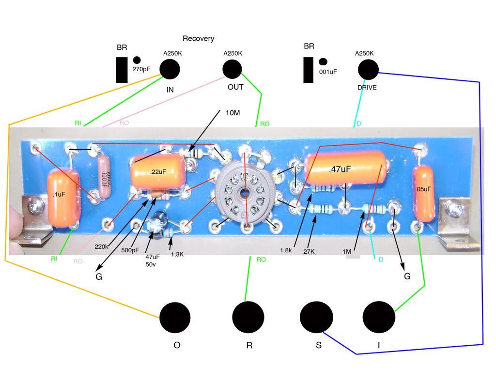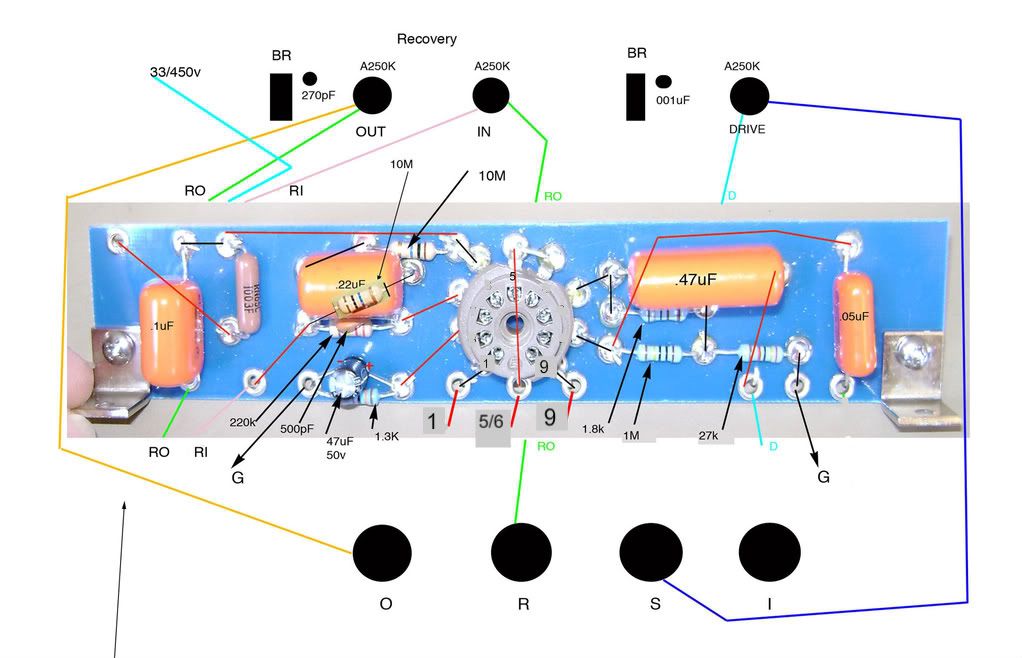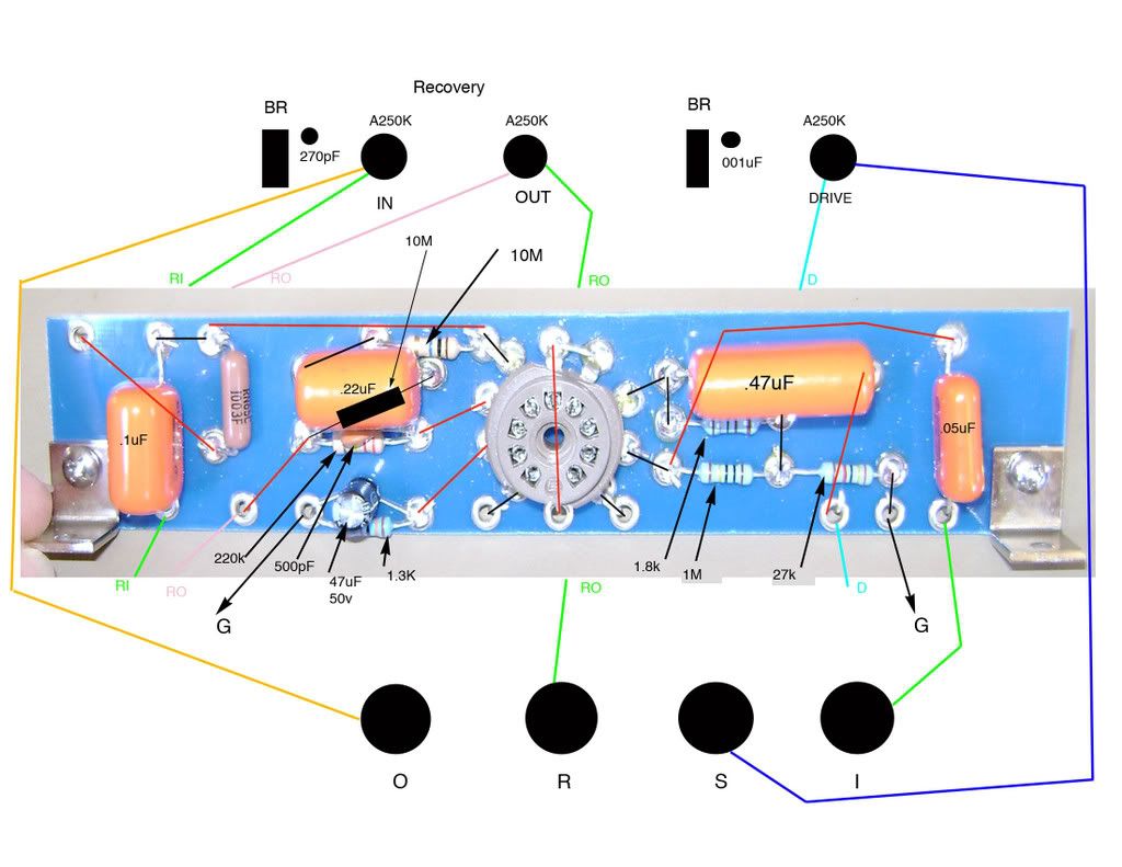 3. I know of one Dumbleator, courtesy of Scott L., where the cathode resistor is 1.3K instead of 1.5K. On that unit, the input resistor on the recovery stage (usually a 220K to ground) is a 250K (I think) pot, mounted on the front panel. Also on that unit, the CF tail is 1.8K, 27K. I know Scott and Gary J. like this arrangement a lot. This is definitely a one of as far as the third pot on the front panel goes. However, that