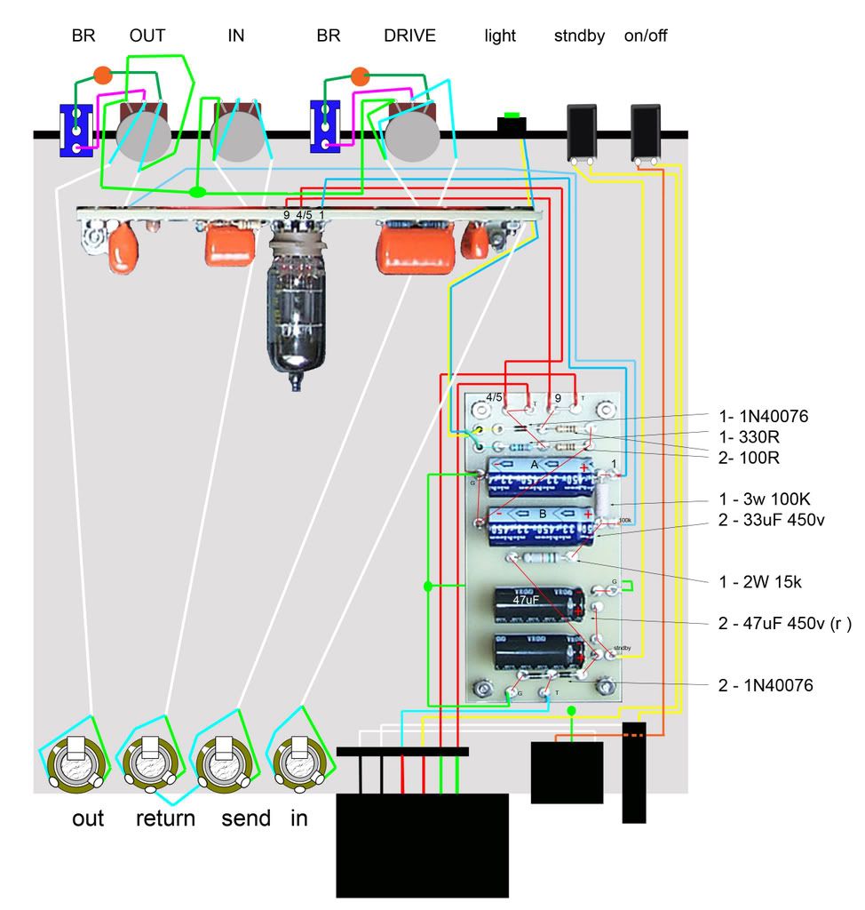 ) that the signal level coming out the FX unit was pretty hot. And, if it was hot coming out, it probably needed to be hot going in... and to accommodate that Dumble gave that CF more voltage headroom. Just an (un)educated guess on my part. Also, I don't understand the reasoning behind descreasing the input impedance via the pot, while at the same time increasing the gain stage by descreasing the cathode resistor from 1.5K to 1.3K. Hack job? Who knows.