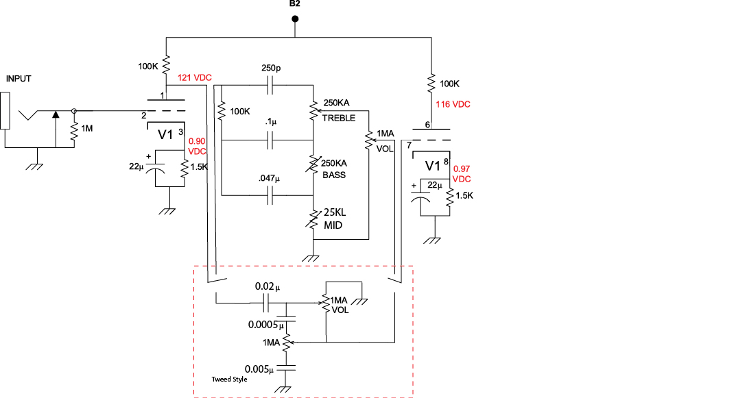 After that I decided to try to put in a more tweed like preamp using a dpdt to make it switchable. I chose the Vol/Tone combo from a Deluxe, used alpha 1M audio pots (like those that came with the kit) and used CBE (Mallory) propylene and one silver mica cap. When I wired this up with the the dpdt switch so I can switch between circuits. Using this the original preamp still worked perfectly but all I got from the tweed preamp position was noise. Then I simplified it to a tweed champ style with one Vol pot and still the same thing. Then i simplified it even more with just the 0.02 mfd cap, so theoretically like a tweed champ at full volume, but still just noise. The switch is wired in properly, as the original postion works fine with no noise. Any ideas? Any help would be greatly appreciated!