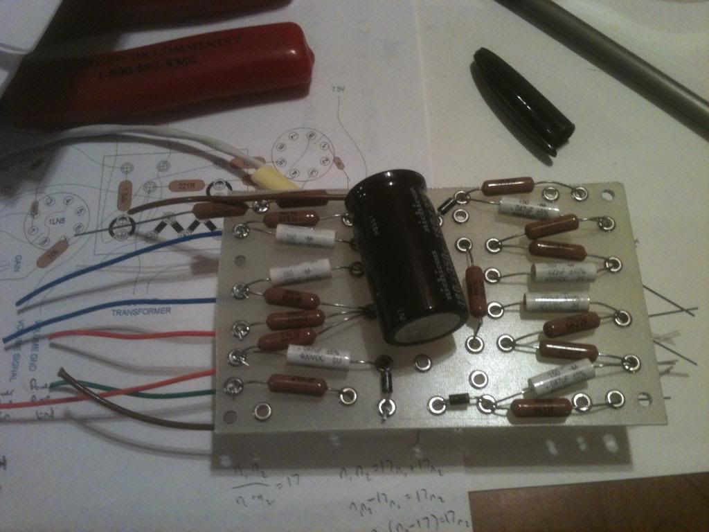 Tone stack - Mildly tweaked Fender Brownface tonestack. I like it because it only has 2 knobs, and works well with high impedance inputs. I'm not wasting a tube on a cathode follower just to drive a tonestack. Even if I was so inclined, it would be weird to try with directly heated cathodes.