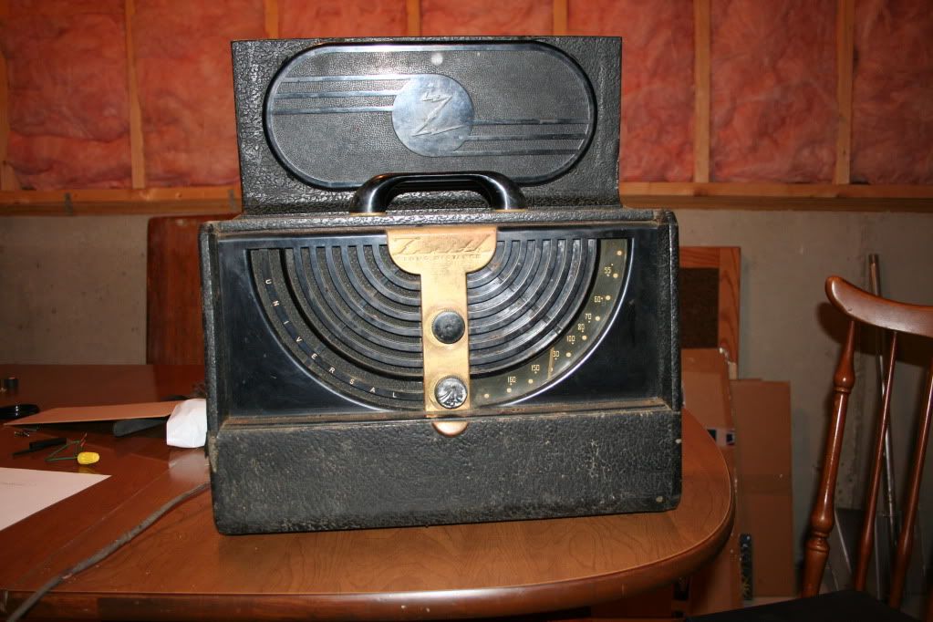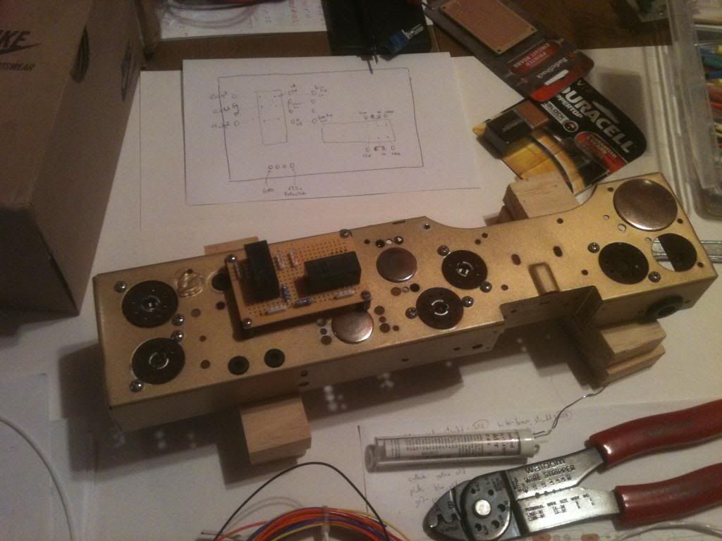 So I spent quite a bit of time trying to figure out how to make a high-gain amp out of this radio. This is a very silly project, these tubes are totally unsuited for the purpose and they pose a lot of challenges. The chassis is also unfit-for-purpose, with tubes at opposite ends, and nothing in the middle. The radio lacks an isolation transformer, but fortunately there's a battery compartment in the "briefcase" where I can put in a power transformer.