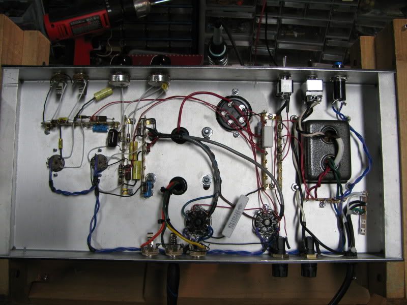The problem I am having is when a note is struck I get a very diminished 60 hz hum with my original note for about 3 seconds and then it stops and all you can hear is the original note. It is as if a noise gate opened and closed, it is that sudden. You have to listen to hear it but it annoys me because it will be out of tune depending on the note struck. I have tried a series of mods including tube recto, prl. the V1 triodes, swapping out bypass cap values, it doesn't matter what I do the only way to get rid of it is to turn down the gain. Otherwise the amp plays and sounds great and my tweaks have taken me through a whole range of sounds and textures with this amp so I pretty much know how I want it set up, I just have to get it to stop. Here are some pics of the chassis for those who like to look.