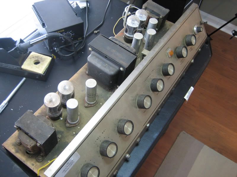 I'm trying to ID my friend's amp and hopefully find a schematic for it. Do you know what this is? It's supposed to be a Silvertone. The closest thing I can find is the 1485, but the tube and tranny layout is different.