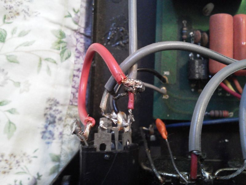 Thanks for the help guys,sorry to be such a simpleton ,but let me just get this straight. The large red wire(new wire that was added during repair) is connected to the braid within the grey wire, I'm believe that it is the ground between the rear and front input jack.