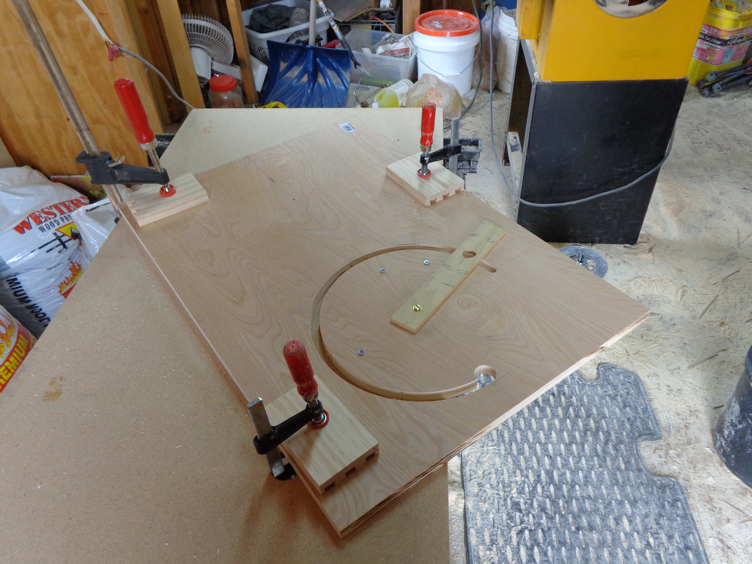 here's my old lo-budget special on a free router I was given. you can buy a jig from partsexpress and rockler but this cost nothing and worked a treat. secret here is to make a few passes and so unscrew the pivot clean out the sawdust, lower bit, repeat. Obviously a piece of scrap ply goes underneath. Not for production but if you're doing just a few baffles now and then. something more open to let the saw dust blow out would be better but this was nicely solid for a bunch of crap quickly slapped together to make baffles on a NYC tenement rooftop.