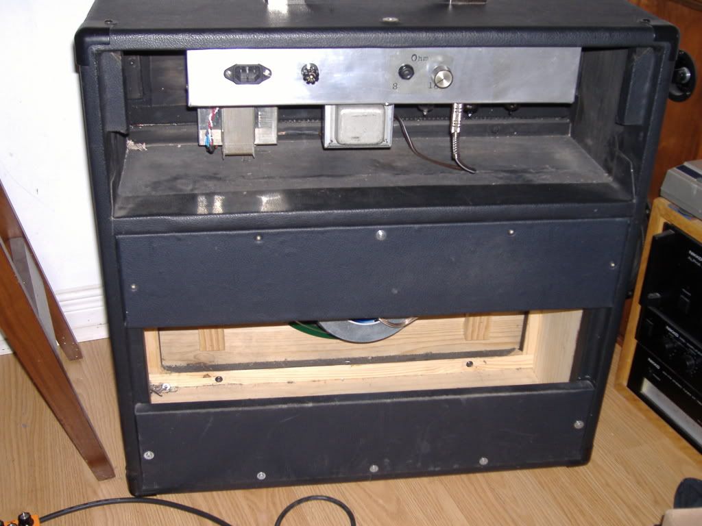 The cab was an experiment with the idea of a combo with a partition between speaker and chassis. Its way over sized for the 12 inch speaker but honestly I have never heard anything sound as good. The dovetail jointed Pine cab is about the size of a Bassman combo. Little on the cumbersome side and not what you would associate with a 15 watter.