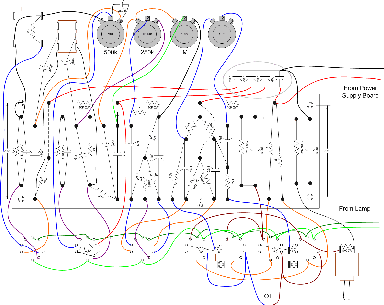 But someone, and I forget who now, suggested alternate values. In particular, the treble cap reduced from 470pf to 47pf, which gets rid of the mid peak. This also resulted in too much bass, so the first coupling cap was cut from 1nf to 500pf. This sounds really great for clean and mild over drive conditions. Crystal clear with excellent string separation and chimey in the top end.