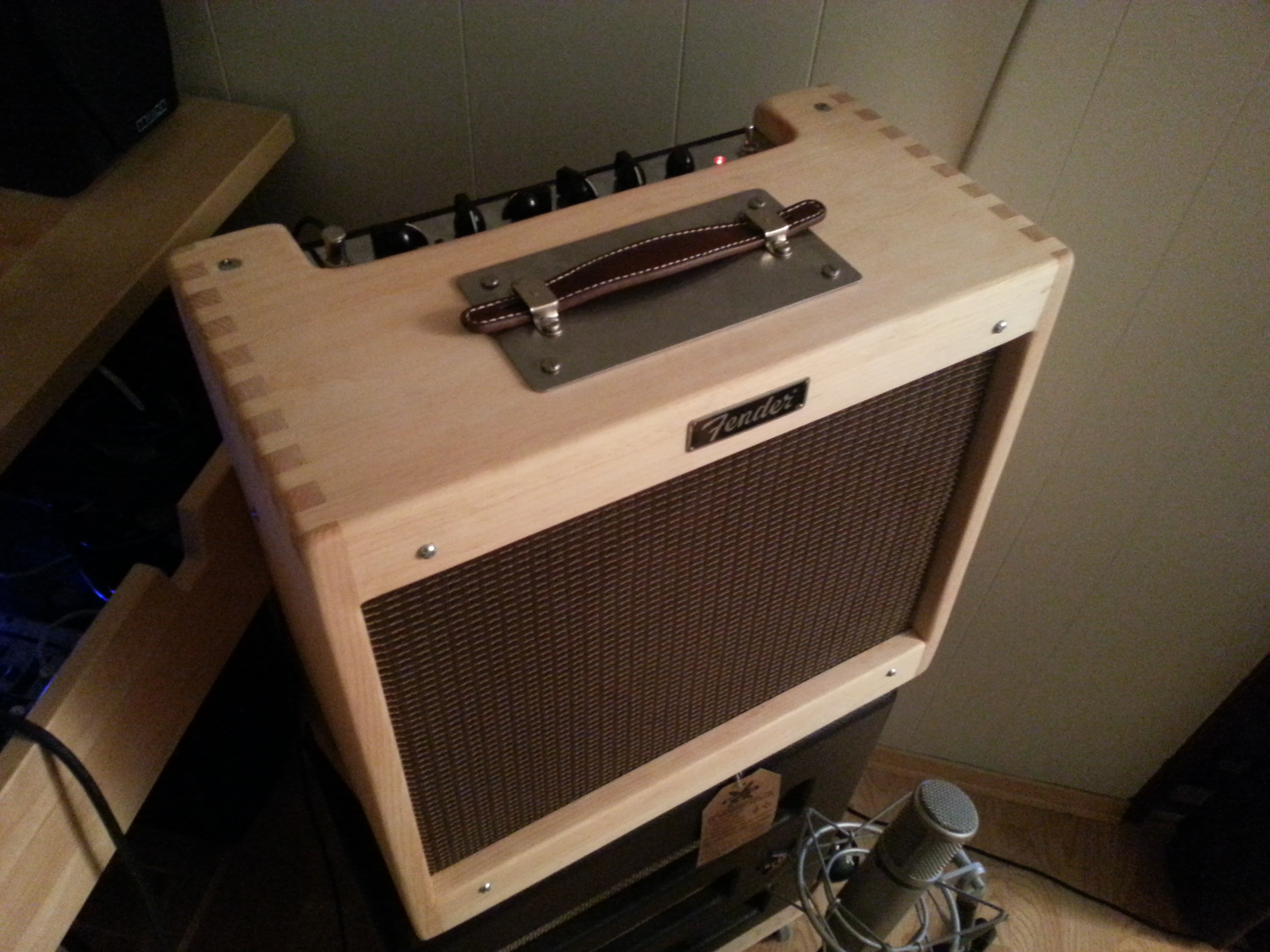 Glue? Thanks for the nice replies. Although I havent milled the finger joints, I have adjusted, assembled, sanded and oiled the cab. The top handle stailess steel plate I got cut out from some leftovers at a local metal-working shop - did cost me one USD. Had to be rounded and grinded. The premilled parts were made by Carls Custom Guitars in Lowel, MA, and yes - I did use glue