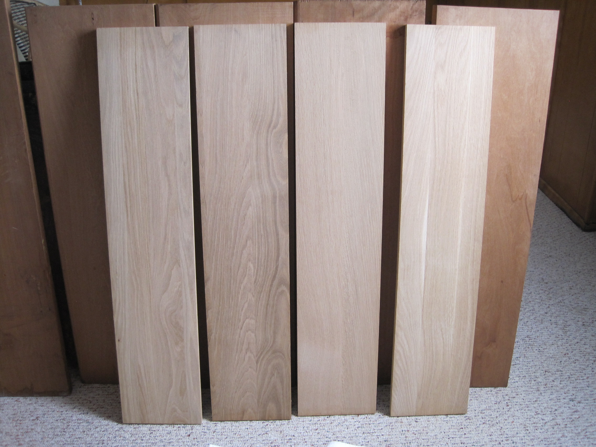 I sure I hope I did OK. Lumber Liquidators posted on CL for unfinished stair treads and risers that have been on the shelf too long. I paid about $2.25/bf for 12 boards, (7) 7" x 36" risers, and (4) treads 11" (including bull nose) x 36", and 1 tread 48" but not in great shape. 4 of the risers are domestic USA white oak, 2 are Santos mahogany, and 1 is a bowed Brazilian cherry that I thought had nice figure. The treads are all Brazilian cherry. I was able to pick through the stock. The 48" tread was sitting on the floor and, while crappy looking, I think there is quite a bit of it that can be salvaged. It looks like all of it except the oak are single boards, not jointed and glued. The guy who helped me was surprised I was finding single wide boards and commented they much have "been here for a long time."