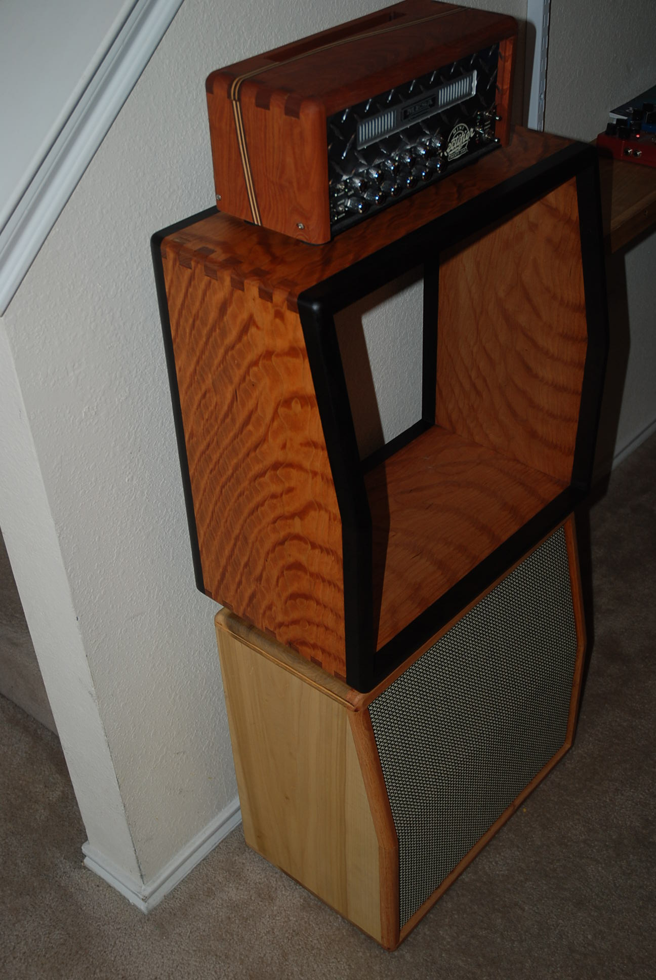 I am working on a design for the speakers to put a gold 10" and a pair of 8" wired separately. More to follow. Will use the same salt and pepper grill cloth as the cab below. Overall dimensions 20.25"x 20.25" x 12". I plan to build a matching head cover with the left over wood.