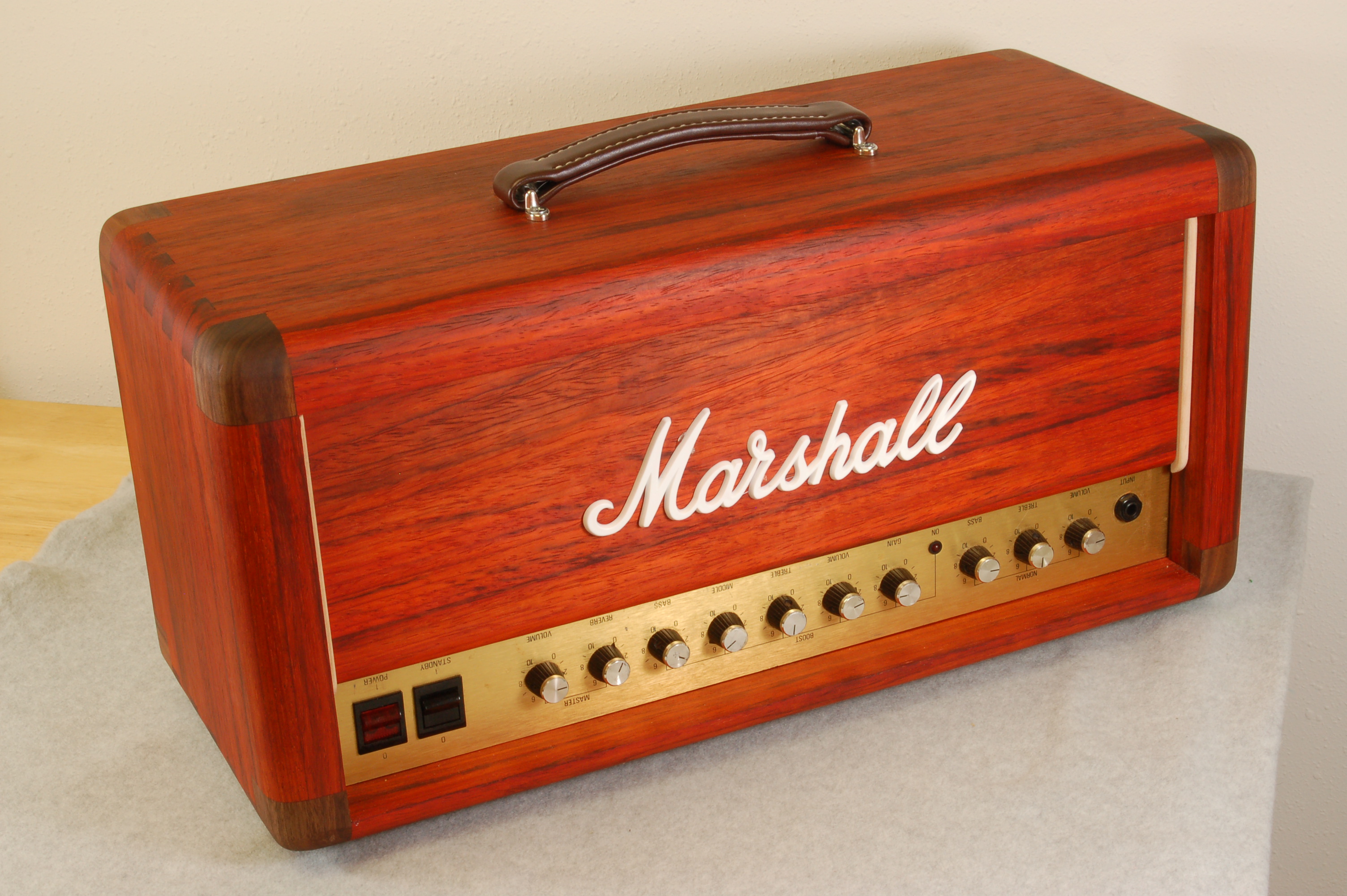 Head cab time. I found some padauk and began to plan. I decided to make the head with the same geometry as Marshall used - 1" round overs on the leading edges. Instead of plastic corners these will be walnut, the piping maple.