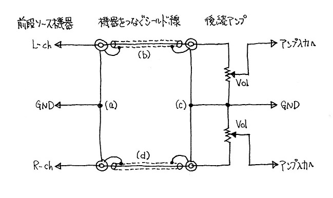 Say an amp output was connected to a stereo configured input stage using the circuit shown in fig.3 for the left and right sides. The previous amp's output has separate L-CH and R-CH outputs, so when connecting these outputs to our input stage (using the fig.3 in stereo circuit) the grounds are split into two before reaching the input stage. The separate ground paths are (a)-(b)-(c) and (a)-(d)-(c).