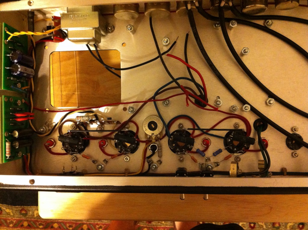 I was out of town for a week so I haven't made as much progress as I would have hoped, but I did get a buch of stuff done yesterday. The relay ps board and bias supply board are wired in as is the indicator lamp. The power tubes are all wired up with OT and choke installed. The foot switch jack and manual switches are wired up. The front bus bar, input jacks, FET board, and all shielded wire is in place.