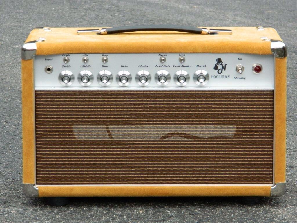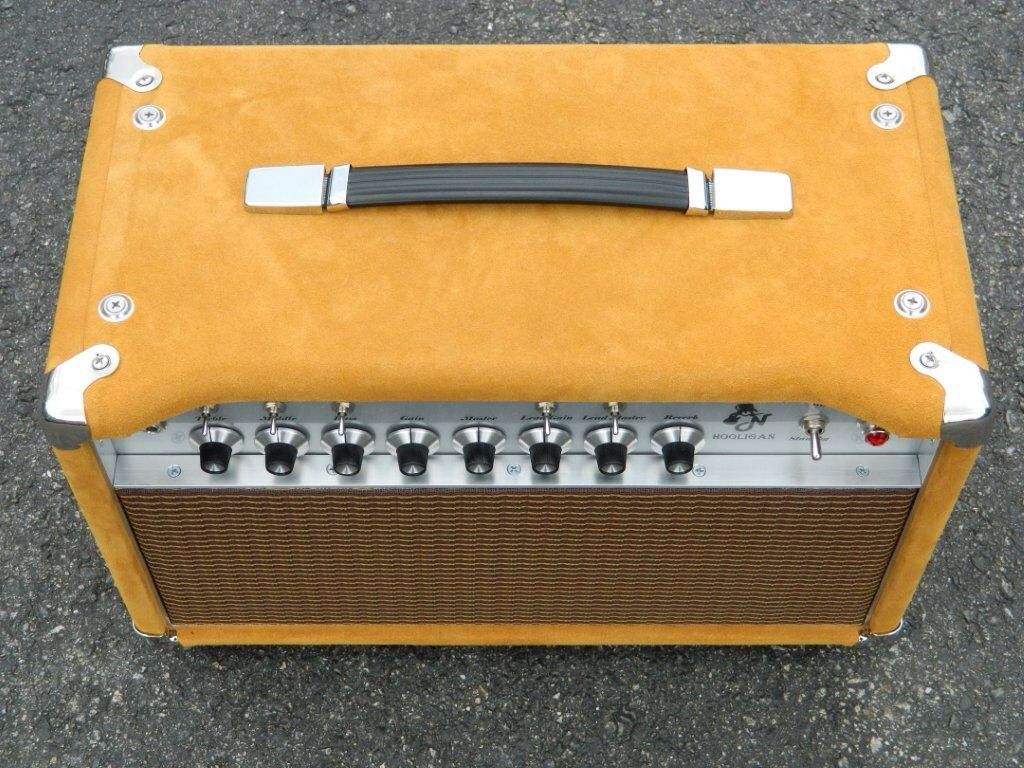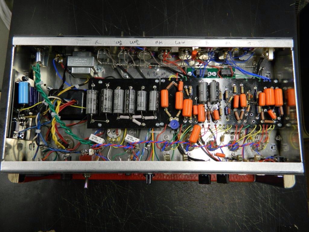 Chassis is 17", GZ34 rectified, Deluxe Reverb Hammond iron. 12v relay setup, two button footswitch. I set it up like a Two Rock, it was the only way to get it all in there. I had to put the contour on the back!