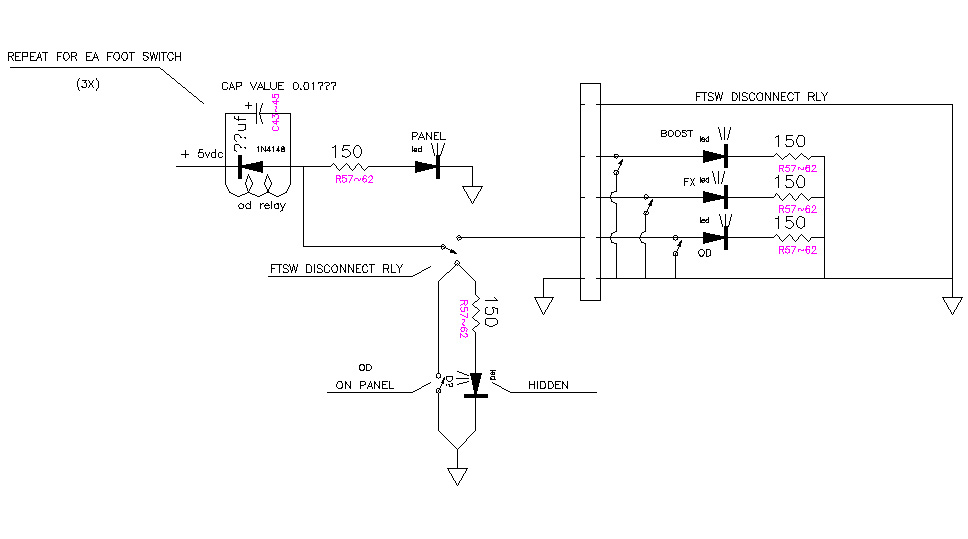 I have just the thing for you. I have had a lot of help from folks in designing a footswitching scheem to allow for boost, overdrive, and fx loop switching at the pedal with leds at the pedal and on the panel. It also allows for switches on the panel. With the plug in, the panel switches are inactive and vice versa.
