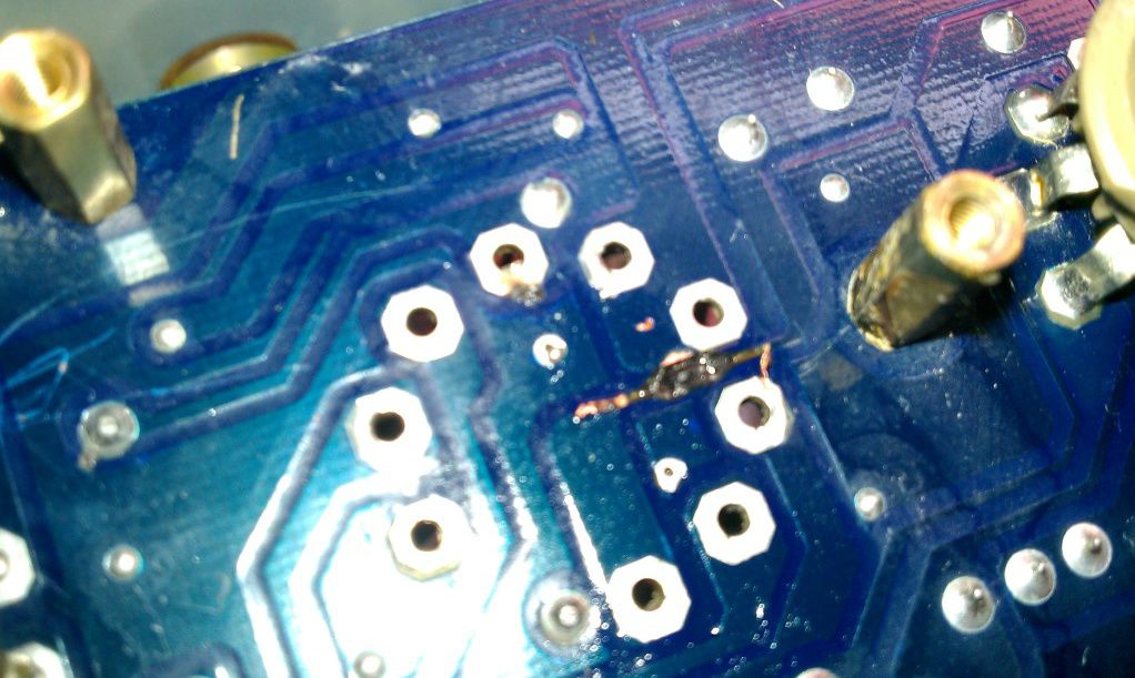 it's a blown up portion of the circuit board and its obviously an open circuit now. so I repaired it like this: