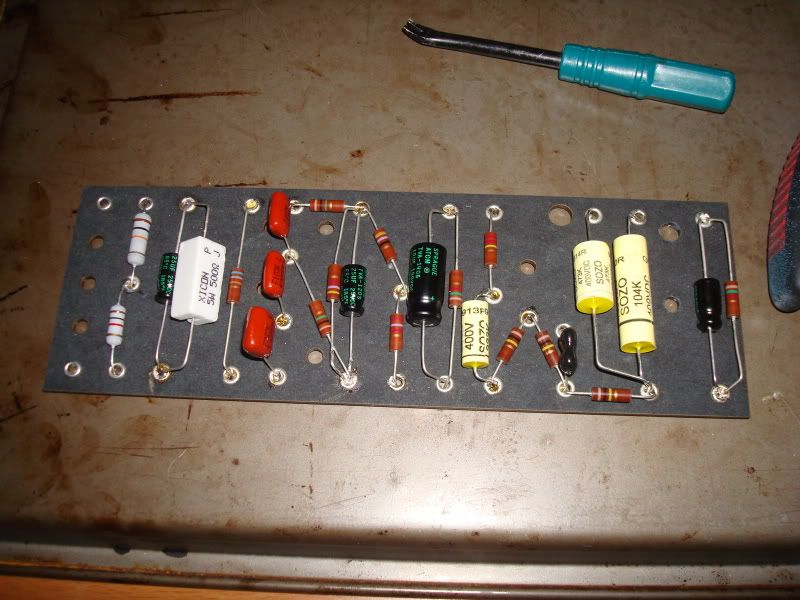 Board completely populated. I tried to be as neat as possible but I kinda messed up at a few spots due to my lack of experience. I cut the leads a bit too short on one of the spragues caps but managed to get it to work. I should have soldered the leads as well, but I didn't cuz that required too much concentration, so I'll solder them later.