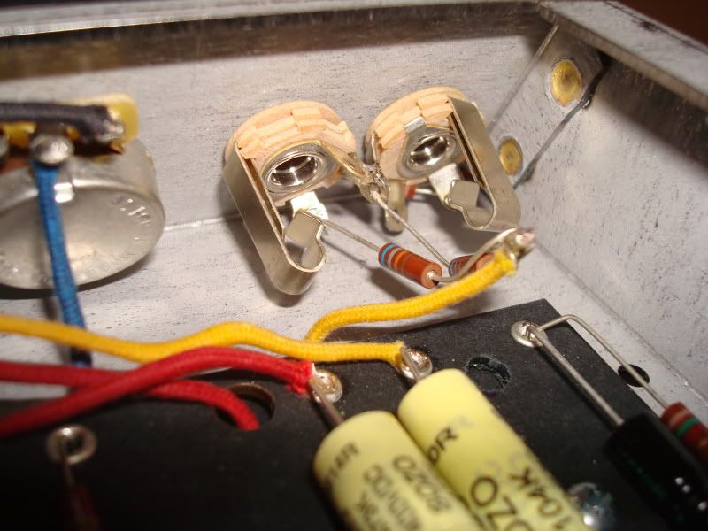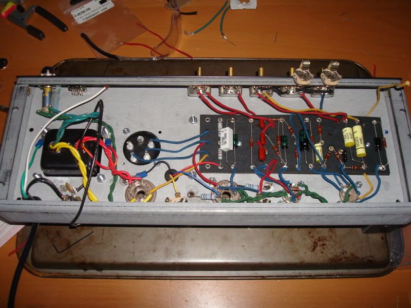 And a picture of where Im at now. I need to wire and ground 2 resistors on the pots and to wire the ac cord to the switch. If you guys spot anything out of place feel free to correct me.