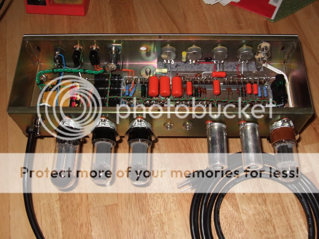 Basically it is a Brown Deluxe preamp paired with a Komet Constellation 6SN7 channel run in parallel into a Brown Deluxe PI which runs into a 5E3-ish cathode biased 6V6 power section. 5AR4 rectified. AC heaters (for now...).