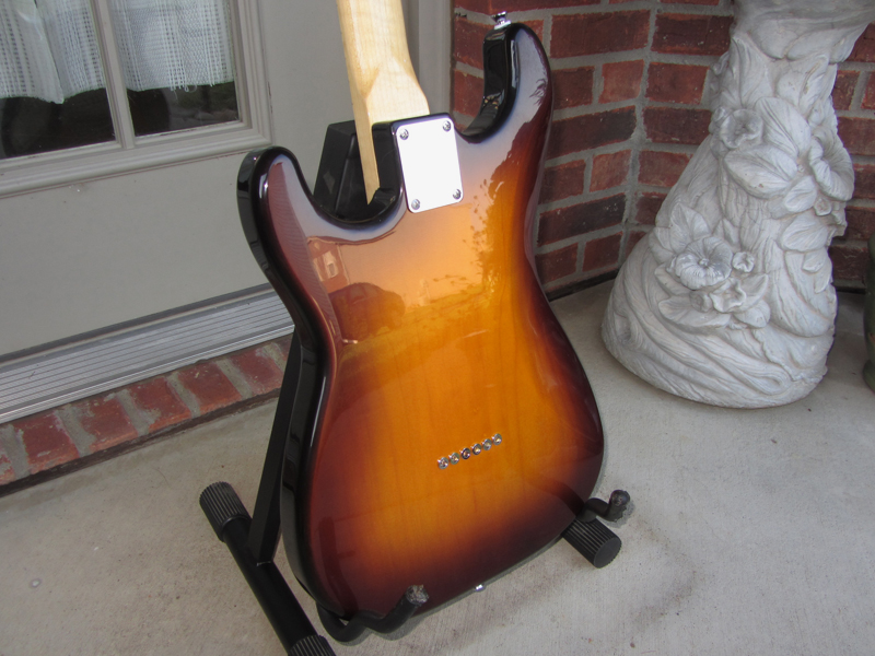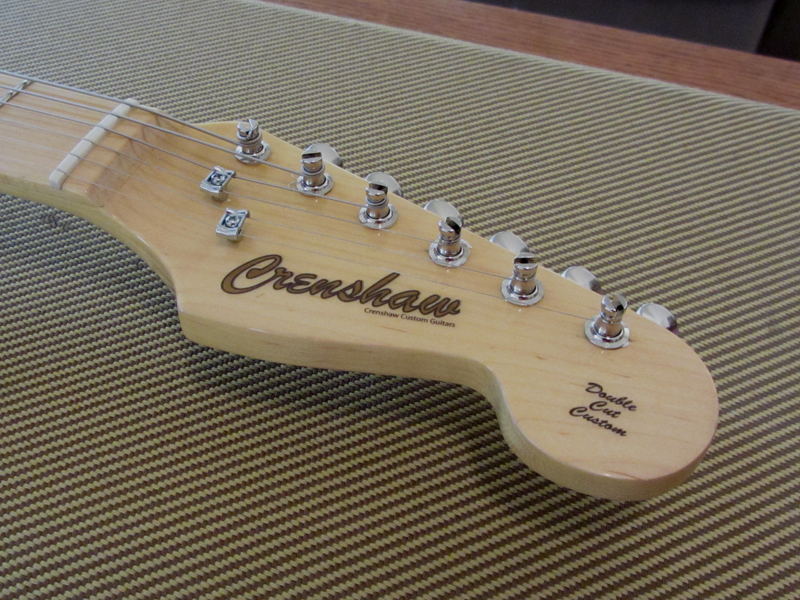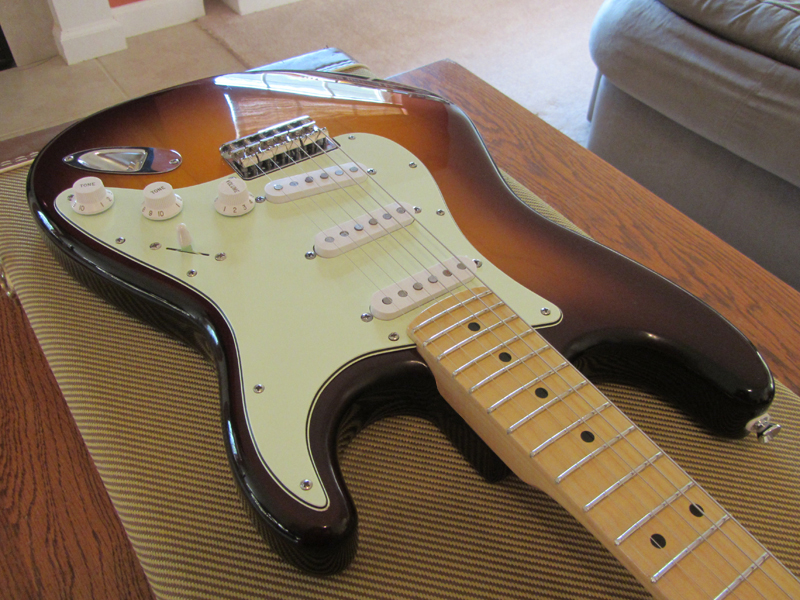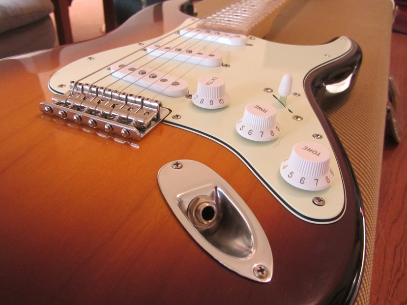 One piece alder body, rock maple neck, black clay markers, vintage tuners, mint green guard with scatter wound Alnico 5 pickups. 2 way truss rod, vintage hardtail bridge, two-tone nitro finish. 6.2 lbs.