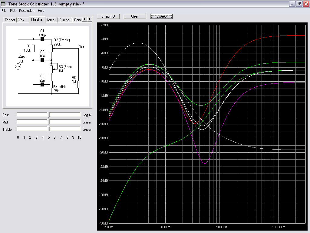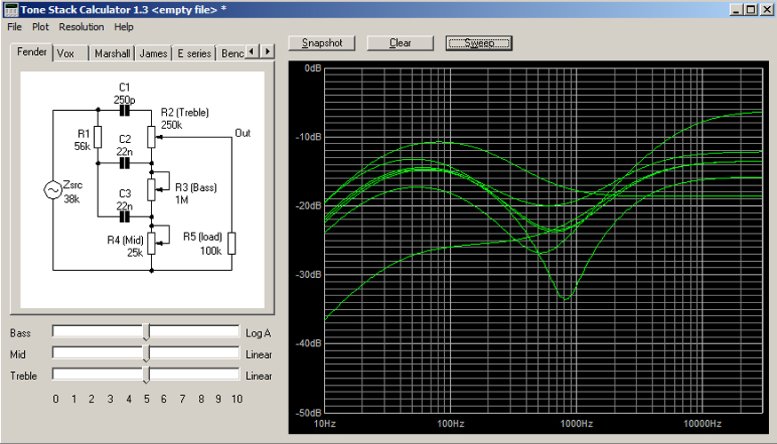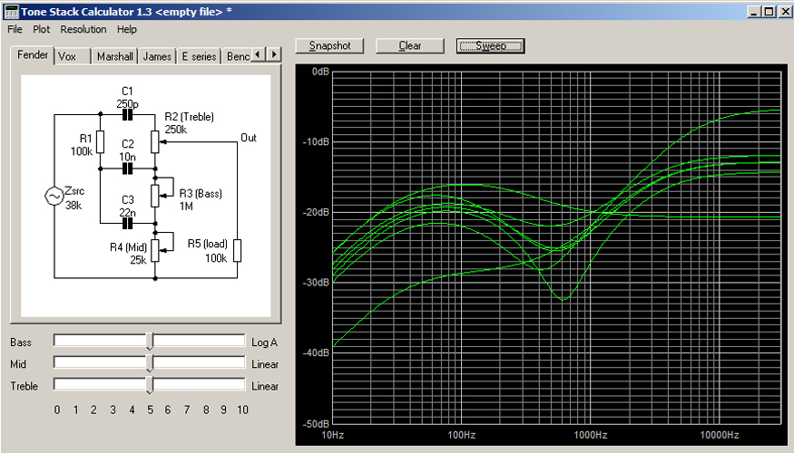 I also ran the '59 specs with a 500K bass pot and it appears to be very similar except it rolls off the bass a bit more from the same 100Hz point and an even shallower dip on the mids. Plus the adjustment range would be a bit smoother over 500K vs 1M. Any downside to the lower bass pot value outside of the changes it makes in the tone stack?