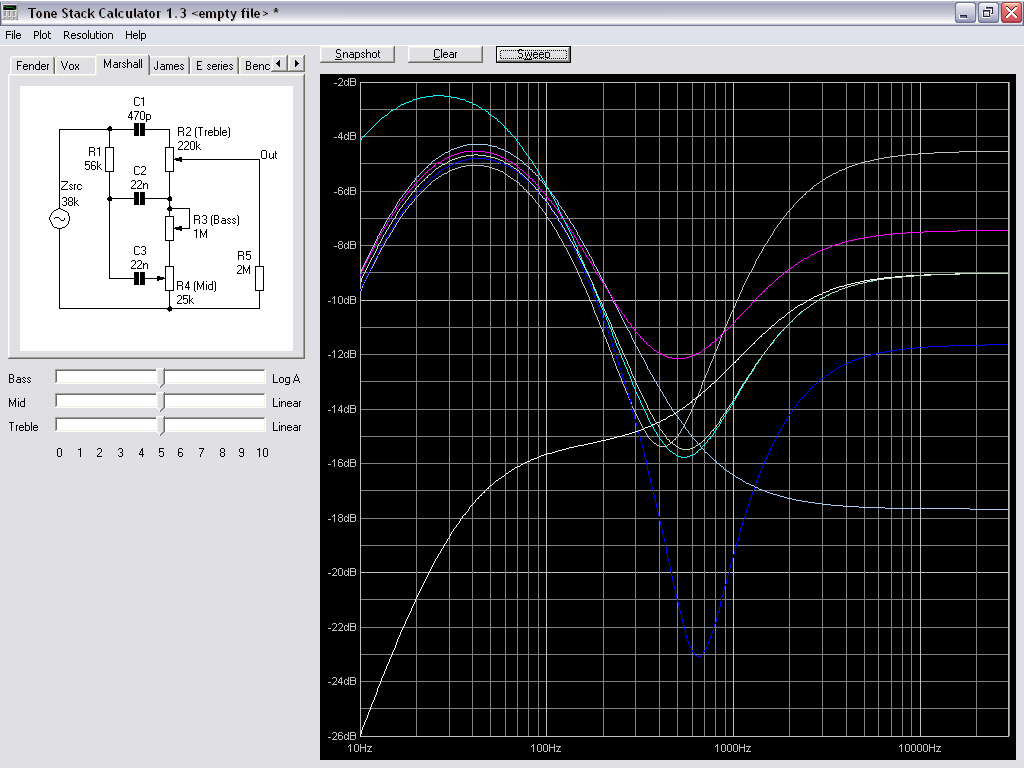 So, the Marshall model set up like you suggested looks like this for '57 and '59. There's no way my amp is cutting bass to that extent. I must still have an issue with that pot. It's just not responding like these plots would indicate. Both plots show a 12db range at 100Hz...that's something I would definitely hear.