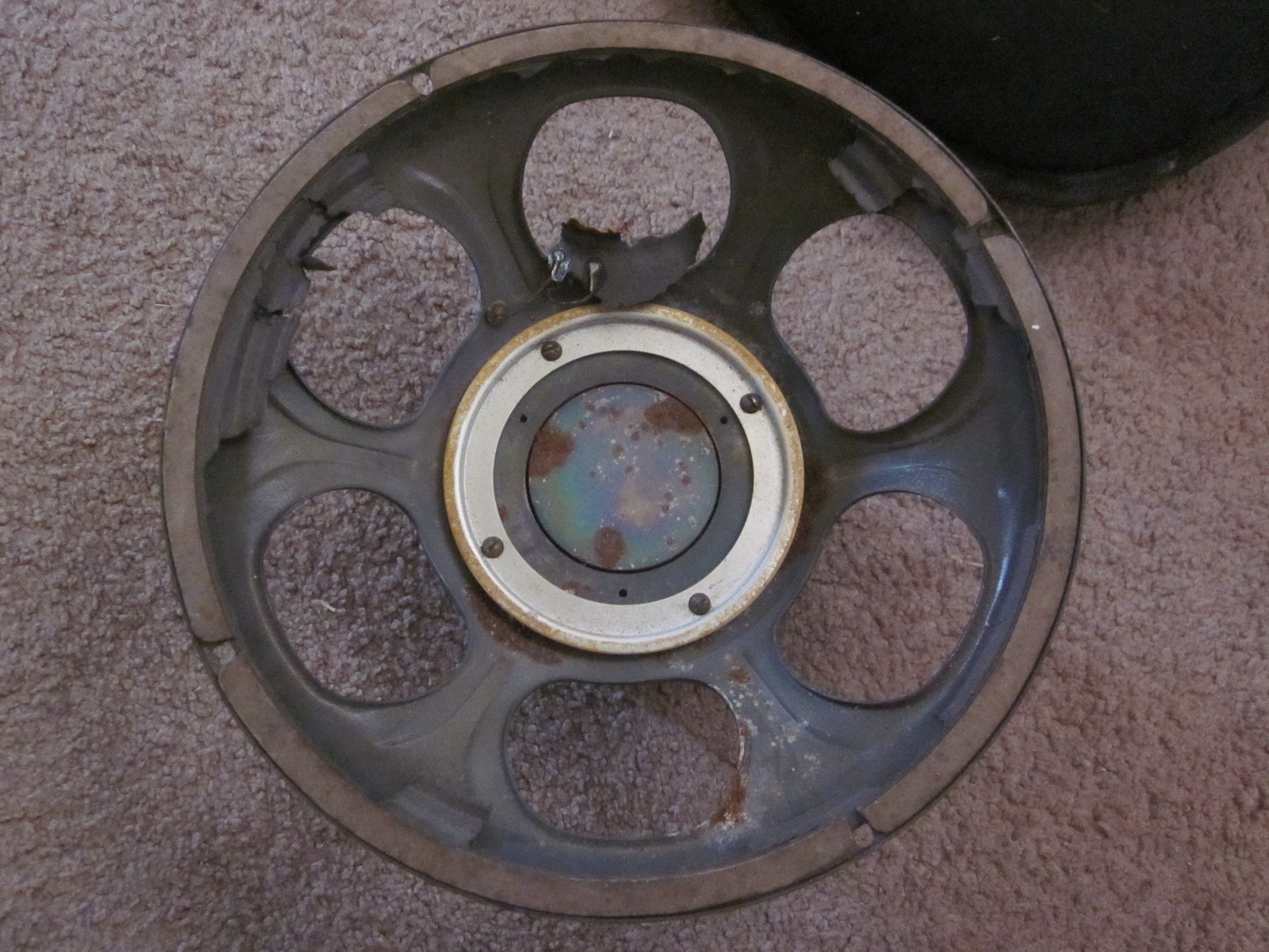 Got a quote today for $125 for the recone. This is reasonable for an Altec/JBL/EV style speaker but alas, this will need to wait until I has a jerb. Unless the speaker is worth more than this after a recone (which it probably isn't), I'm going to just set this aside and keep a close eye on the light rust. I don't think it will get any worse sitting in my closet.