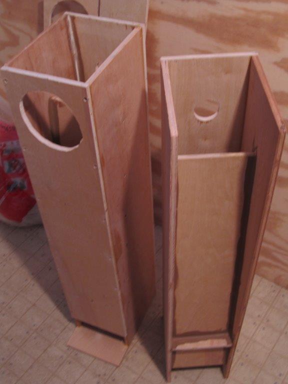 I started by gluing n screwing the sides to the center baffle, then the front n back, followed by mounting the speaker, wiring, binding posts, and stuffing. Then the top and bottom plates. The only trick part is gluing a wood piece about 6"x1"or so to the front panel and baffle, establishing the end off the line. It has to be 6" above the port opening. I sealed all joints with construction adhesive. I put a deflex pad on the baffle directly behind the speaker, and stuffed the line with about half a pound of acoustastuff. I drilled several holes and ran picture hanging wire across the port several times to keep her cat from getting stuck inside. I filled the screw holes, applied clear lacquer, followed by 2 coats of wax and buff. She hated the look and spray painted them that shit brown color. I hope it flakes off and really looks bad.